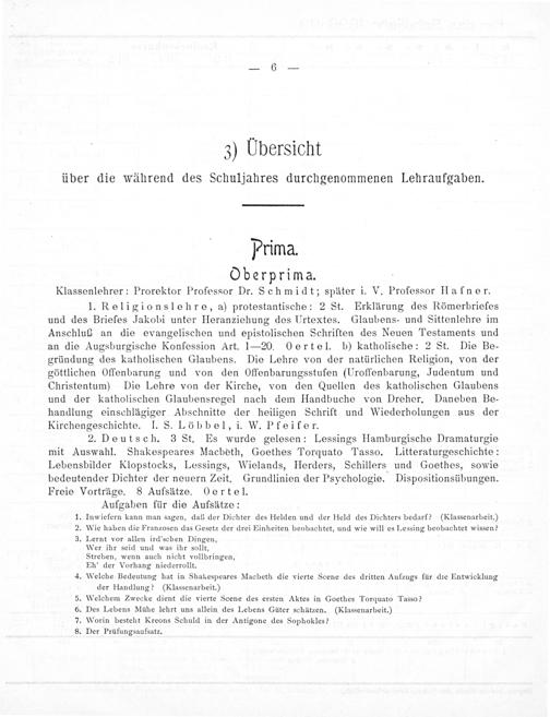 Klassenlehrer: Prorektor Professor Dr. Schmidt; später i. V. Professor Hafner.