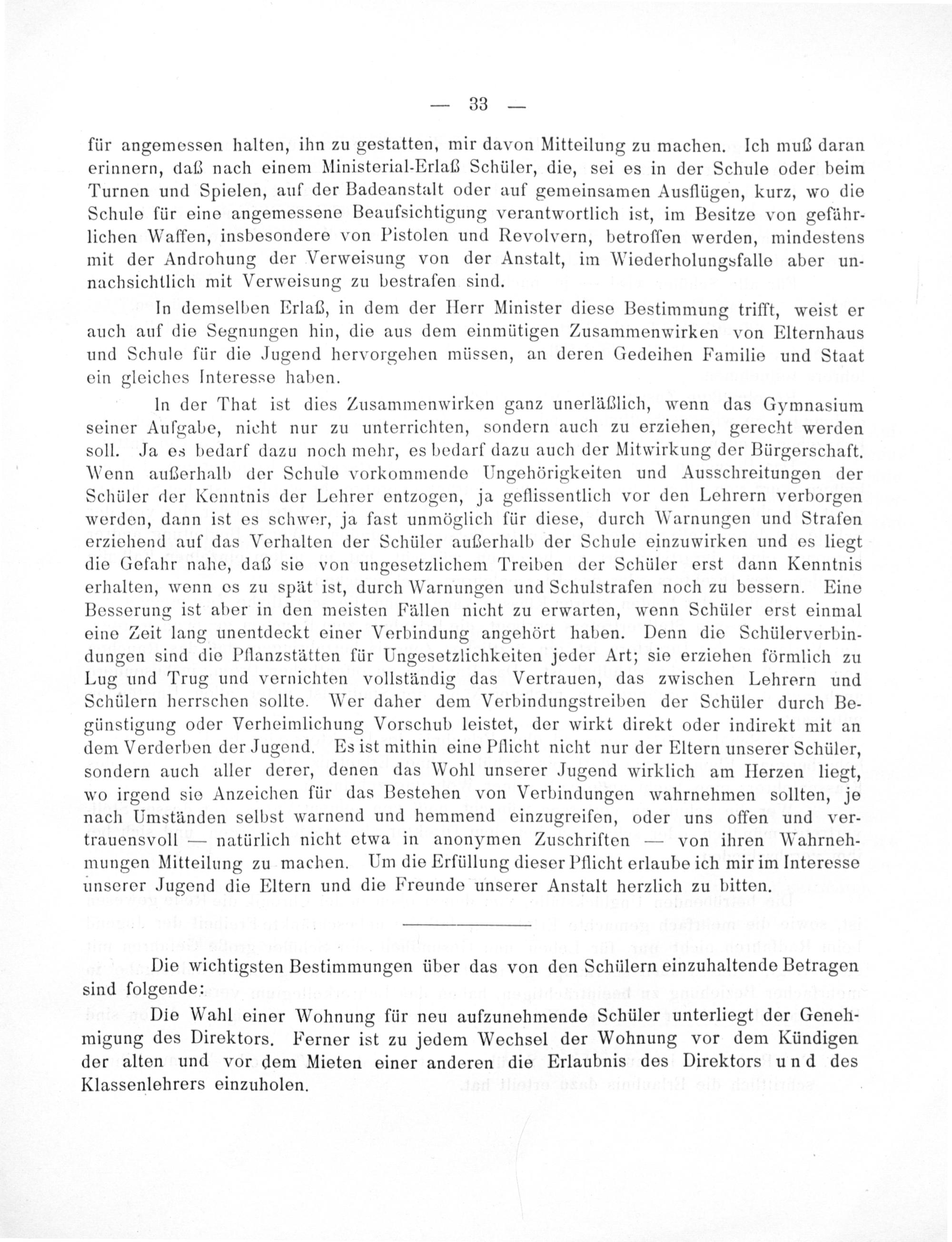 In der That ist dies Zusammenwirken ganz unerläßlich, wenn das Gymnasium seiner Aufgabe, nicht nur zu unterrichten, sondern auch zu erziehen, gerecht werden soll. Ja es bedarf dazu noch mehr, es bedarf dazu auch der Mitwirkung der Bürgerschaft. Wenn außerhalb der Schule vorkommende Ungehörigkeiten und Ausschreitungen der Schüler der Kenntnis der Lehrer entzogen, ja geflissentlich vor den Lehrern verborgen werden, dann ist es schwer, ja fast unmöglich für diese, durch Warnungen und Strafen erziehend auf das Verhalten der Schüler außerhalb der Schule einzuwirken und es liegt die Gefahr nahe, daß sie von ungesetzlichem Treiben der Schüler erst dann Kenntnis erhalten, wenn es zu spät ist, durch Warnungen und Schulstrafen noch zu bessern. Eine Besserung ist aber in den meisten Fällen nicht zu erwarten, wenn Schüler erst einmal eine Zeit lang unentdeckt einer Verbindung angehört haben. Denn die Schülerverbin- dungen sind die Pflanzstätten für Ungesetzlichkeiten jeder Art; sie erziehen förmlich zu Lug und Trug und vernichten vollständig das Vertrauen, das zwischen Lehrern und Schülern herrschen sollte. Wer daher dem Verbindungstreiben der Schüler durch Be— günstigung oder Verheimlichung Vorschub leistet, der wirkt direkt oder indirekt mit an dem Verderben der Jugend. Es ist mithin eine Pflicht nicht nur der Eltern unserer Schüler, sondern auch aller derer, denen das Wohl unserer Jugend wirklich am Herzen liegt, wo irgend sie Anzeichen für das Bestehen von Verbindungen wahrnehmen sollten, je nach Umständen selbst warnend und hemmend einzugreifen, oder uns offen und ver-— trauensvoll— natürlich nicht etwa in anonymen Zuschriften— von ihren Wahrneh- mungen Mitteilung zu machen. Um die Erfüllung dieser Pflicht erlaube ich mir im Interesse unserer Jugend die Eltern und die Freunde unserer Anstalt herzlich zu bitten.