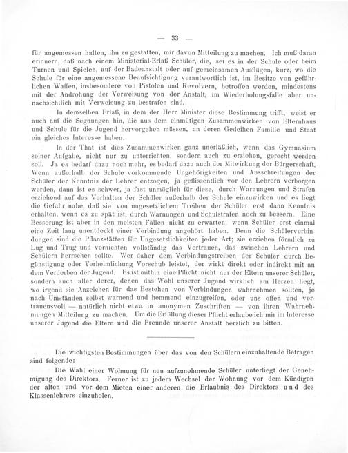 für angemessen halten, ihn zu gestatten, mir davon Mitteilung zu machen. Ich muß daran erinnern, daß nach einem Ministerial-Erlaß Schüler, die, sei es in der Schule oder beim Turnen und Spielen, auf der Badeanstalt oder auf gemeinsamen Ausflügen, kurz, wo die Schule für eine angemessene Beaufsichtigung verantwortlich ist, im Besitze von gefähr- lichen Waffen, insbesondere von Pistolen und Revolvern, betroffen werden, mindestens mit der Androhung der Verweisung von der Anstalt, im Wiederholungsfalle aber un- nachsichtlich mit Verweisung zu bestrafen sind.