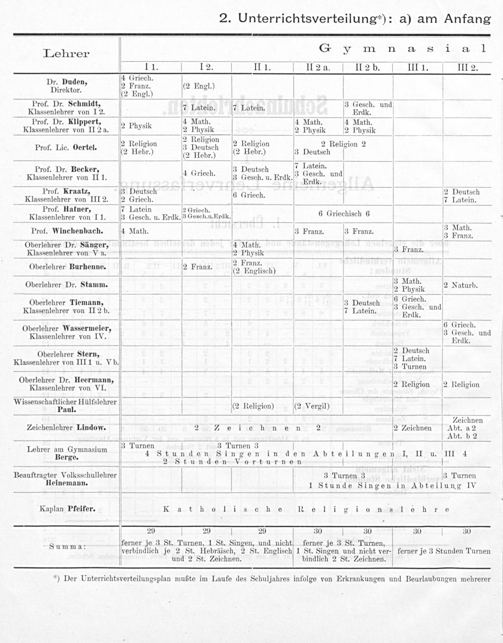 —ᷣ—ÿ—ꝛꝛᷣ:P——-——.———— Lehrer Gymna s 1 2 1 11. 12. II 1. IIZ2 a. II 2 b. II1 1. III 2. 4 Griech. De. Duden, 2 Franz.(2 Engl.) D o⸗(2 Engl.) Prof. Dr. Schmidt, 3; 3 Gesch. und Klassenlehrer von 12. 7 Latein. 7 Latein. Erdk. Prof. Dr. Klippert, 2 Phvsik 4 Math. 4 Math. 4 Math. Klassenlehrer von II 2 a. 7 2 Physik 2 Physik 2 Physik .. 2 Religion..““ . 2 Religion w 2 Religion 2 Religion 2 Prof. Lie. Oertel.(2 Hebr.) 6 Neaneh(2 Hebr.) 3 Deutsch Prof. Dr. Becker, 14 3 Deutsch 7 Patein. ö Klassenlehrer von II 1. 4 Griech. 3 Gesch. u. Erdk. ³ Hosen und Prof. Kraatz, 3 Deutsch 4 2 Deutsch Klassenlehrer von III 2.([2 Griech. 6 Grioch. 7 Latein. Prof. Hafner, 7 Latein 2 Griech. riechi Klassenlehrer von I1. 3 Gesch. u. Erdk. 3 Gesch. u. Erdk. 6 Griechisch 6 Prof. Winchenbach. 4 Math. 3 Franz. 3 Franz. 3 Math. 3 Franz. Oberlehrer Dr. Sänger, 4 Math. 1 Srn Klassenlehrer von V a. 2 Physik Tank. 11. 4 2 Franz. Oberlehrer Burhenne. 2 Franz.(2 Englisch) 4 4 3 Math.. Oberlehrer Dr. Stamm. 2 Physik 2 Naturb. Oberlehrer Tiemann, 3 Deutsch 3 Geioch. 4 Klassenlehrer von II 2 b. 7 Latein. Erdk Fun 6 Griech. Oberlehrer Wassermeier, 3 Ge Klassenlehrer von IV. 3 G desch. und Erdk. Oberlehrer Stern, 2 Peuſaen Klassenlehrer von III 1 u. Vb. atoin. 3 Turnen Oberlehrer Dr. Heermann V:.„1.. Klassenlehrer von VI. 3 2 Religion 2 Religion Wissenscboffliohee Hülfslehrer b(2 Religion) Vergil) Zeichnen Zeichenlehrer Lindow. 2 Z e ichnen 2 2 Zeichnen Abt. 3 2 Abt. b 2 .. 4 3 Turnen 3 Turnen 3 Lehrer am Gymnazium 4 Stunden Singen in den Abteilungen 1, II u. III 4 Se. 2 Stunden Vorturnen Beauftragter Volksschullehrer 3 Turnen 3 3 Turnen