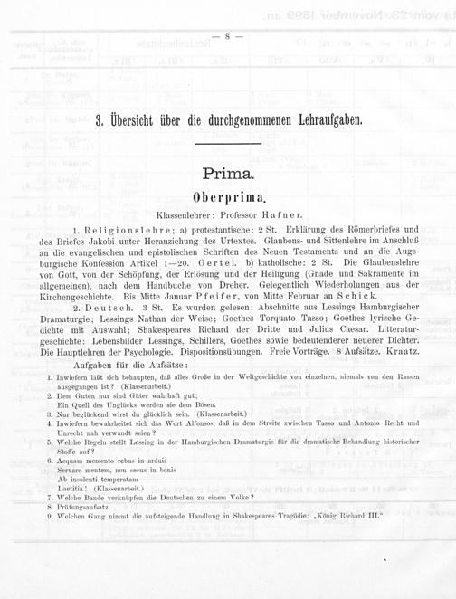 2. Deutsch. 3 St. Es wurden gelesen: Abschnitte aus Lessings Hamburgischer Dramaturgie; Lessings Nathan der Weise; Goethes Torquato Tasso; Goethes lyrische Ge- dichte mit Auswahl; Shakespeares Richard der Dritte und Julius Caesar. Litteratur- geschichte: Lebensbilder Lessings, Schillers, Goethes sowie bedeutenderer neuerer Dichter. Die Hauptlehren der Psychologie. Dispositionsübungen. Freie Vorträge. 8 Aufsätze. Kraatz.
