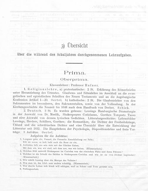 2. Deutsch. 3 St. Es wurden gelesen: Lessings Hamburgische Dramaturgie in der Auswahl von Dr. Manlik, Shakespeares Coriolanus, Goethes Torquato Tasso und eine Auswahl von dessen lyrischen Gedichten. Litteraturgeschichte: Lebensbilder Lessings, Herders, Schillers, Goethes; die Romantiker, die Dichter der Freiheitskriege, Uhland und die schwäbischen Dichter und eine Ubersicht über die Entwicklung der Litteratur seit 1832. Die Hauptlehren der Psychologie, Dispositionslehre und freie Vor- träge. 8 Aufsätze. Oertel.