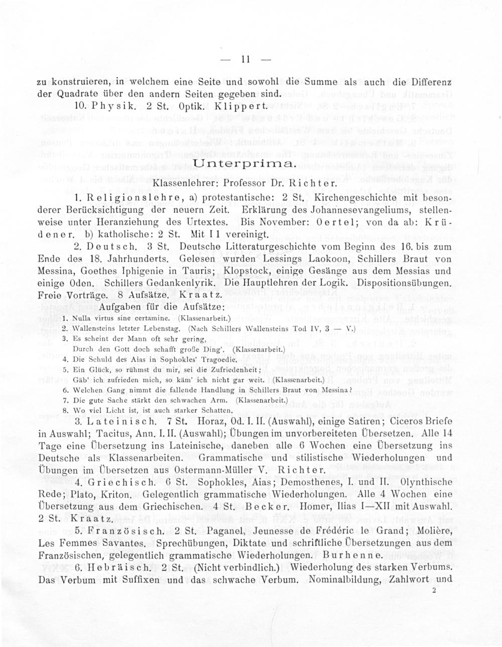 2. Deutsch. 3 St. Deutsche Litteraturgeschichte vom Beginn des 16. bis zum Ende des 18. Jahrhunderts. Gelesen wurden Lessings Laokoon, Schillers Braut von Messina, Goethes Iphigenie in Tauris; Klopstock, einige Gesänge aus dem Messias und einige Oden. Schillers Gedankenlyrik. Die Hauptlehren der Logik. Dispositionsübungen. Freie Vorträge. 8 Aufsätze. Kraatz.