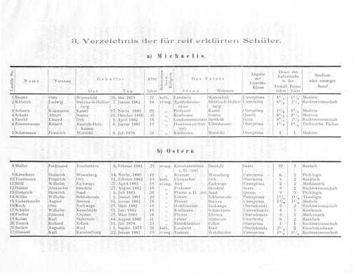 16 Koch Otto Eschwege 27. März 1882 19„ Hotelbesitzer Eschwege Obersekunda 3 2 Rechtswissenschaft 17 Schäfer Wilhelm Kesselstadt 11. Juni 1882 419„ Kaufmann Schlüchtern Untersekunda 4 2 Kaufmann