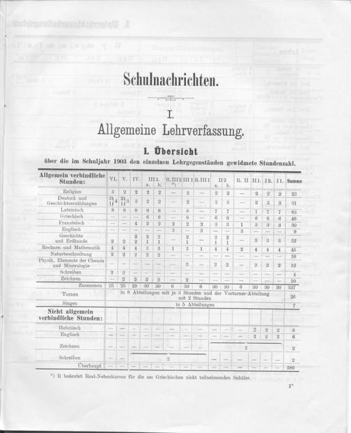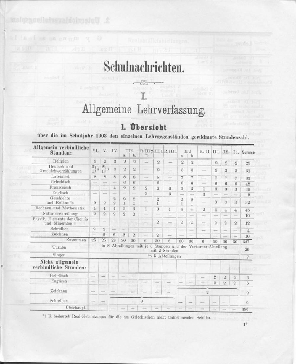 1. Ubersicht über die im Schuljahr 1903 den einzelnen Lehrgegenständen gewidmete Stundenzahl.
