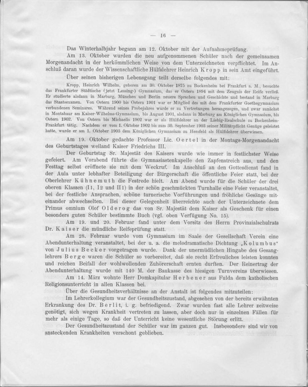 Kropp, Heinrich Willelm, geboren am 90, Oktsber 1875 zu Backenbeim bei Fraukfurt a. l, besuchte das Prankfurter Stidti-che(jetet Lassing.) Giymmasium, das er Oetern 1804 mit dem Zaugnis der Reite verlie Ir studiarte alaiann in Alarharr, Altmehen und Rerin veuens Spmehen uni Giesehiehte und bettand in Marburs das Staatsermmen. Von Oeterm 19000 bis Oeterm 1901 war er litelied des mit dem PFranbfurter Gcethecrmnseium rerhundenen Seminaree. Während teimes Prabejahres wurde er au Vexteetungen herangezogen, und zwar auniehat in lantabaur am aiser Wilholme Gammasium, his Aucust 190, abdann in Mardung am Kumieſiehen Ciymmaiium, bis Ostern 1902. Von Ostern bis liehals 1902 war er als Hlülſlehrer an der Liehig Realschuls au Barkenbein. Prankfurt tutig. Naebdem er vom 1. Oxiaber 1902 bis zum 30. September 100C eeiner Alihtarpüleht Genügo geleietet lutte, wurie er am 1. Oxtober 1900 dem Kanirlichen Gymnarium zu llersfeli als Hültlehrer herwiesan.