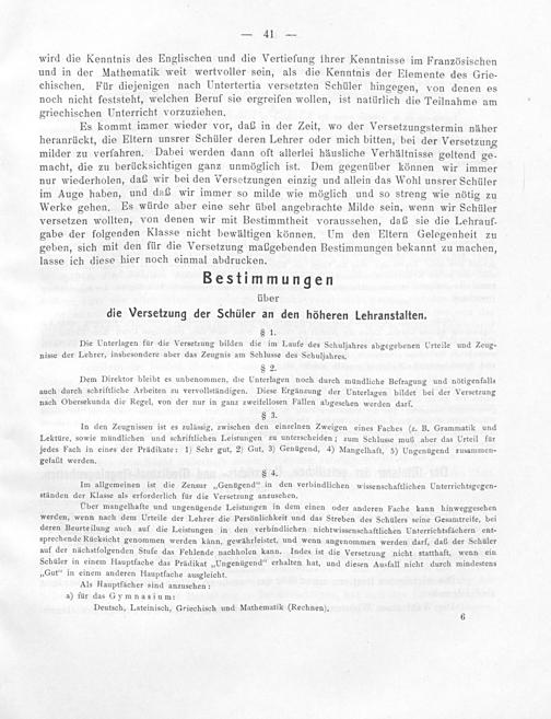 Dem Direktor bleibt es unbenommen, die Unterlagen noch durch mündliche Befragung und nötigenfalls auch durch schriftliche Arbeiten zu vervollständigen. Diese Ergänzung der Unterlagen bildet bei der Versetzung nach Obersekunda die Regel, von der nur in ganz zweifellosen Fällen abgesehen werden darf.