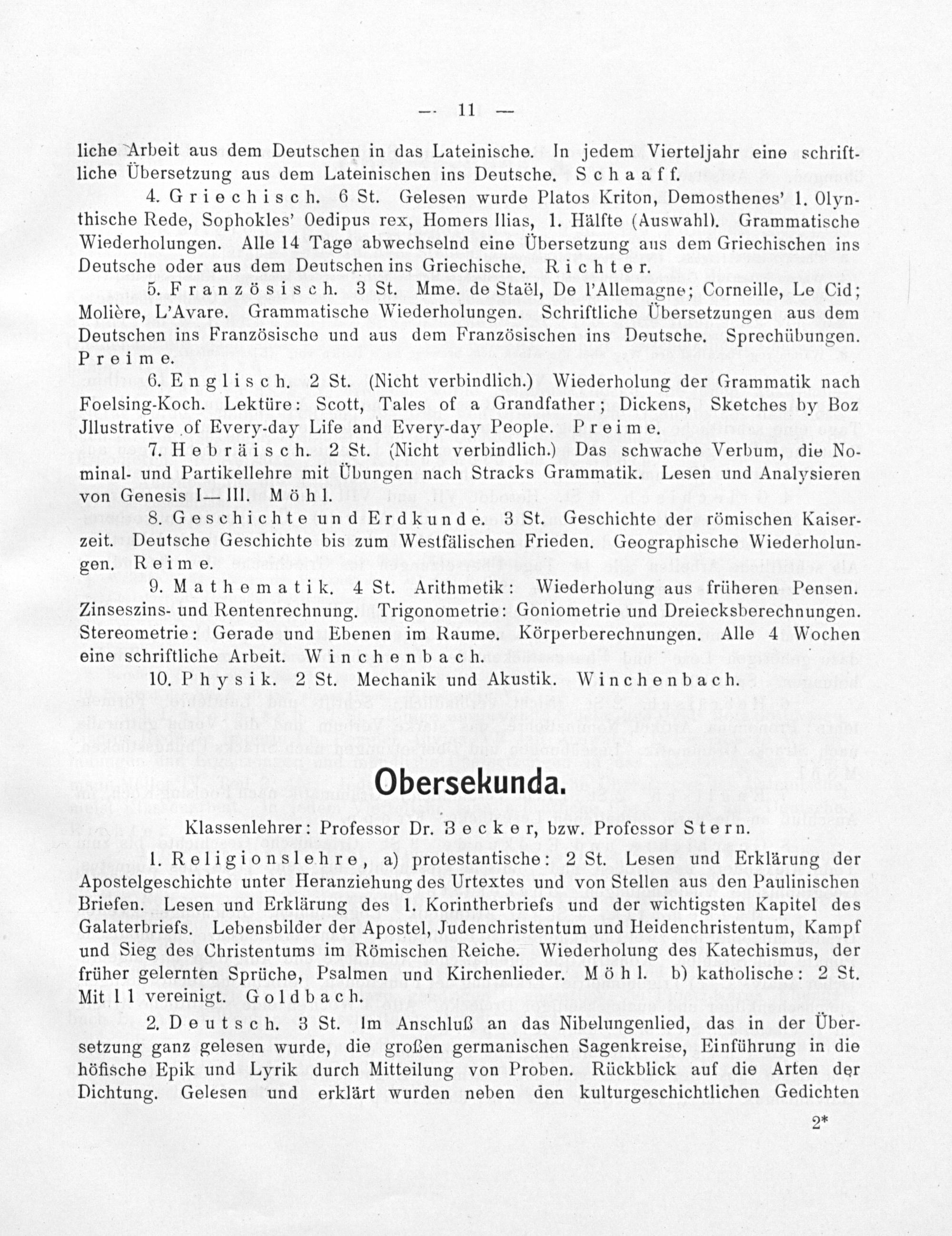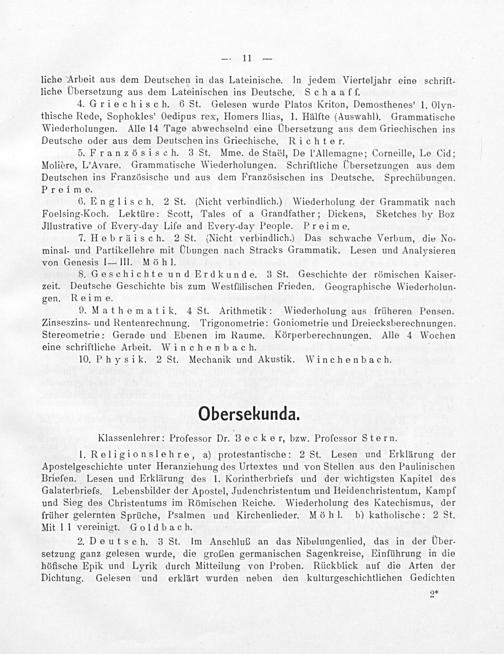 1. Religionslehre, a) protestantische: 2 St. Lesen und Erklärung der Apostelgeschichte unter Heranziehung des Urtextes und von Stellen aus den Paulinischen Briefen. Lesen und Erklärung des 1. Korintherbriefs und der wichtigsten Kapitel des Galaterbriefs. Lebensbilder der Apostel, Judenchristentum und Heidenchristentum, Kampf und Sieg des Christentums im Römischen Reiche. Wiederholung des Katechismus, der früher gelernten Sprüche, Psalmen und Kirchenlieder. Mö hl. b) katholische: 2 St. Mit I1 vereinigt. Goldbach.