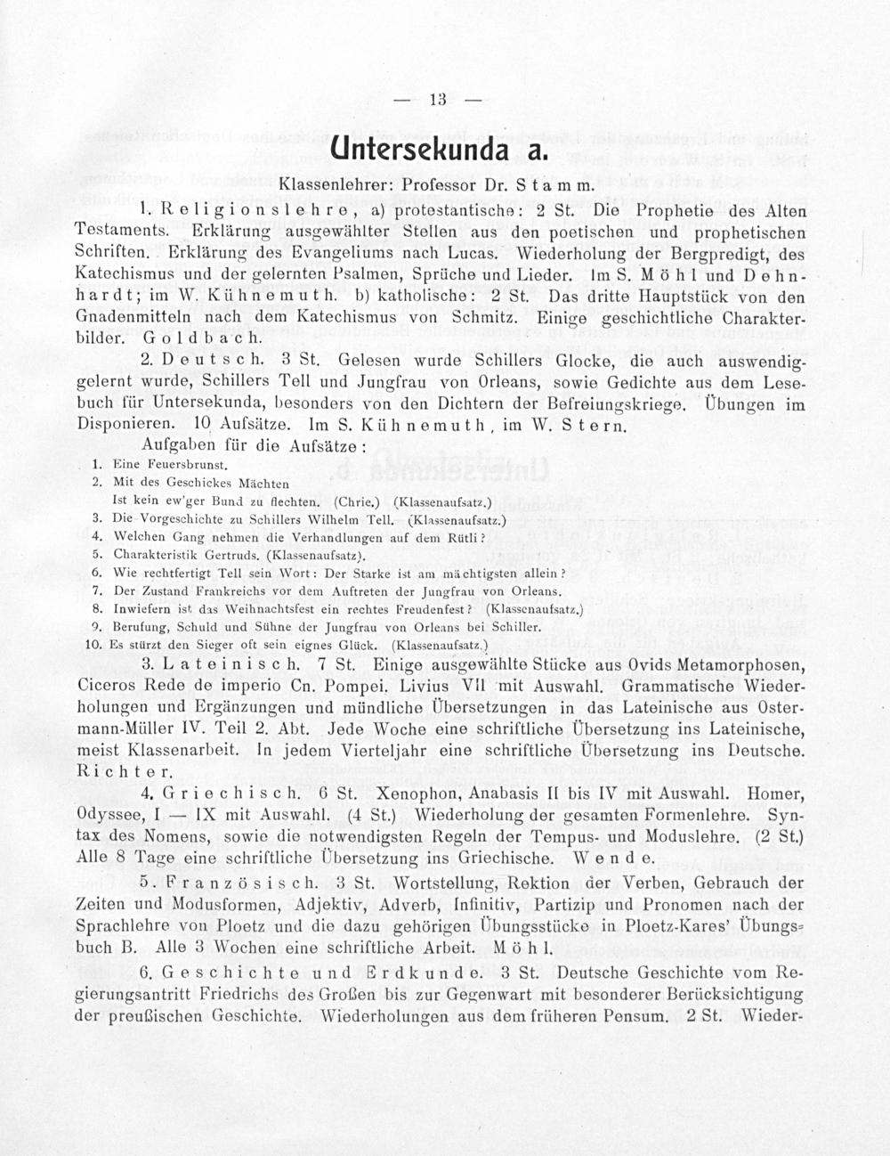 2. Deutsch. 3 St. Gelesen wurde Schillers Glocke, die auch auswendig- gelernt wurde, Schillers Tell und Jungfrau von Orleans, sowie Gedichte aus dem Lese- buch für Untersekunda, besonders von den Dichtern der Befreiungskriege. UÜbungen im Disponieren. 10 Aufsätze. Im S. Kühnemuth, im W. Stern.