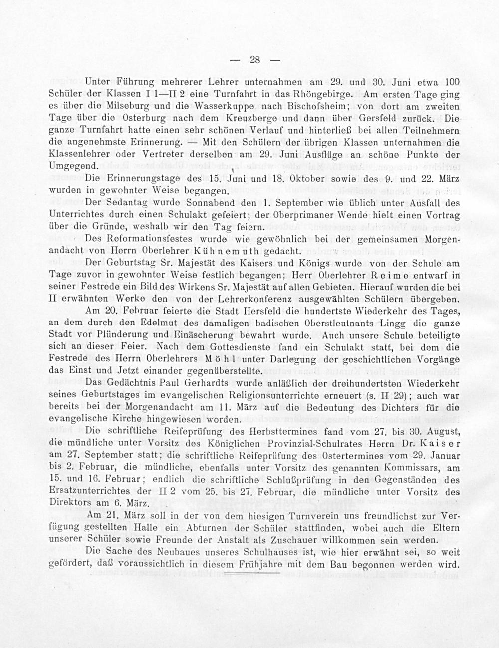 Unter Führung mehrerer Lehrer unternahmen am 29. und 30. Juni etwa 100 Schüler der Klassen I1—II 2 eine Turnfahrt in das Rhöngebirge. Am ersten Tage ging es über die Milseburg und die Wasserkuppe nach Bischofsheim; von dort am zweiten Tage über die Osterburg nach dem Kreuzberge und dann über Gersfeld zurück. Die- ganze Turnfahrt hatte einen sehr schönen Verlauf und hinterließ bei allen Teilnehmern die angenehmste Erinnerung.— Mit den Schülern der übrigen Klassen unternahmen die Klassenlehrer oder Vertreter derselben am 29. Juni Ausflüge an schöne Punkte der Umgegend.