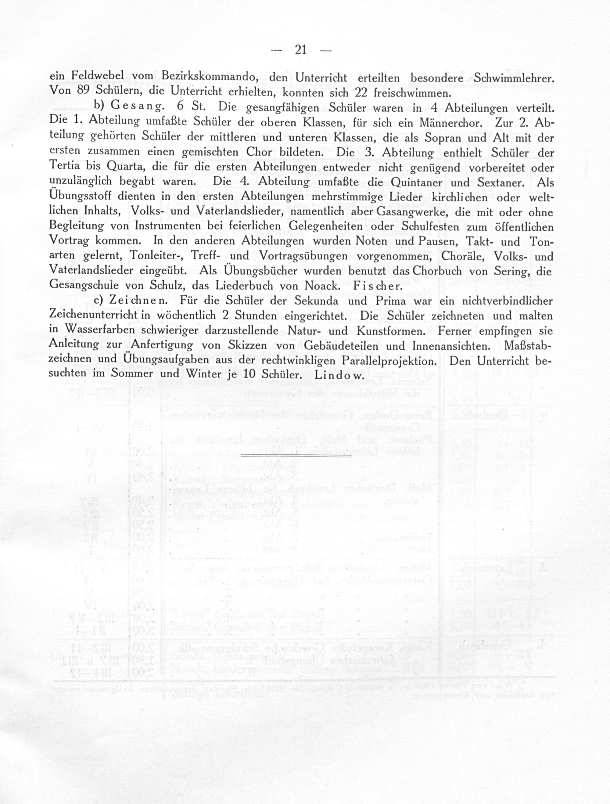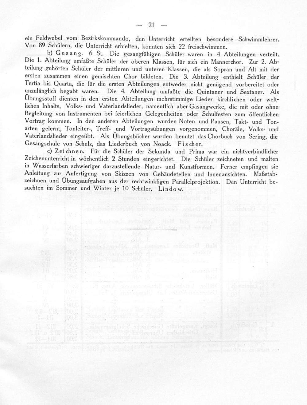 c) Zeichnen. Für die Schüler der Sekunda und Prima war ein nichtverbindlicher Zeichenunterricht in wöchentlich 2 Stunden eingerichtet. Die Schüler zeichneten und malten in Wasserfarben schwieriger darzustellende Natur- und Kunstformen. Ferner empfingen sie Anleitung zur Anfertigung von Skizzen von Gebäudeteilen und Innenansichten. Maßstab- zeichnen und Übungsaufgaben aus der rechtwinkligen Parallelprojektion. Den Unterricht be- suchten im Sommer und Winter je 10 Schüler. Lindo w.