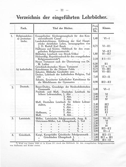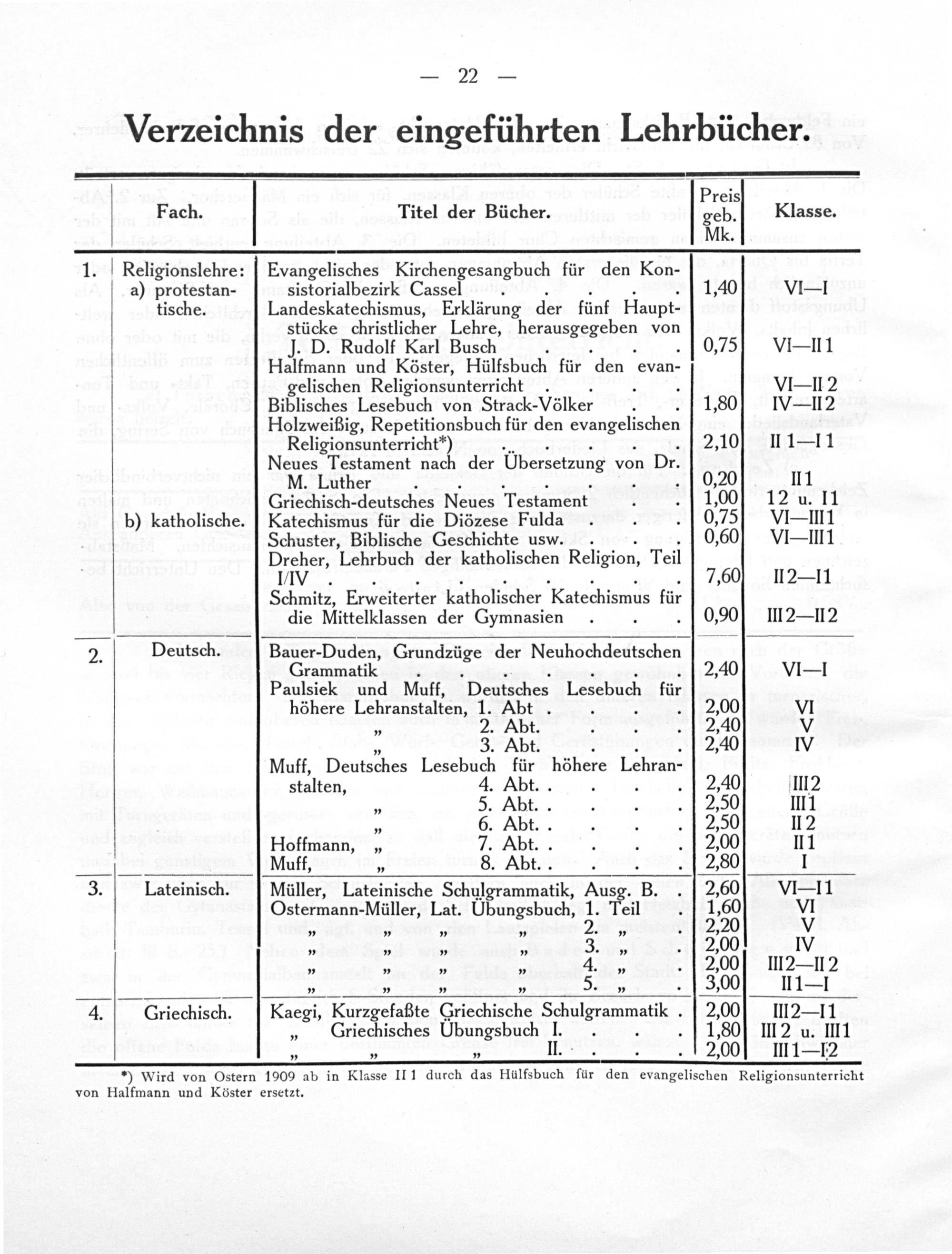 *) Wird von Ostern 1900 ab in Klasse II1 durch das Hülfsbuch für den evangelischen Religionsunterricht von Halfmann und Köster ersetzt.