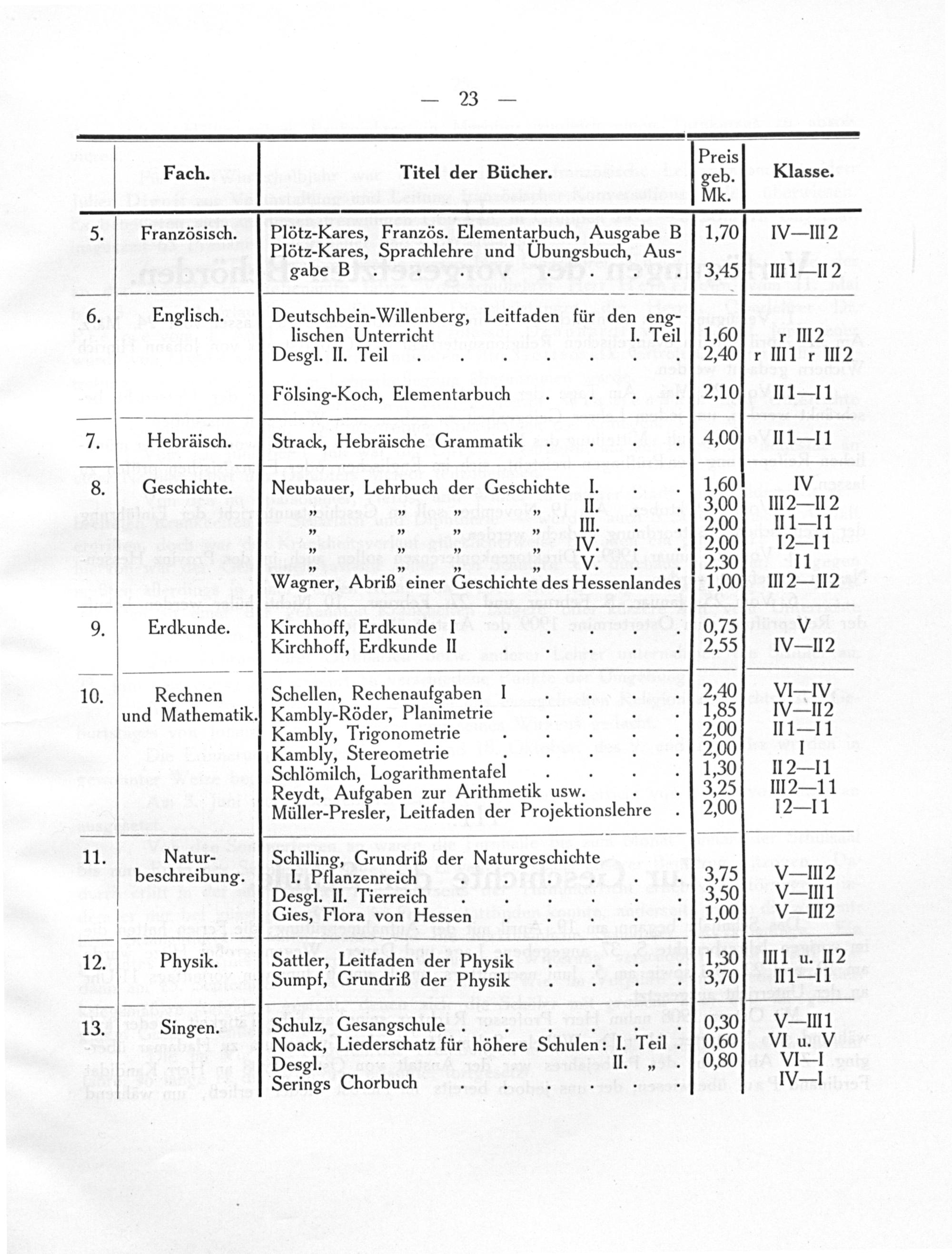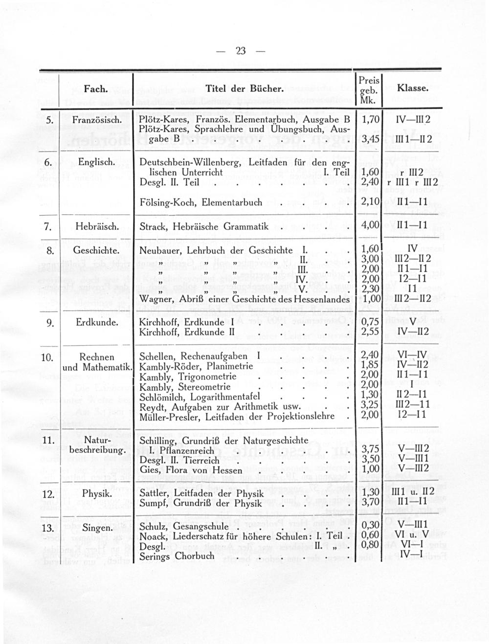 p Preis Fach. Titel der Bücher. geb. Klasse. Mk. 5. Französisch. Plötz-Kares, Französ. Elementarbuch, Ausgabe B1,70 V- llI 2 Plötz-Kares, Selehre und Ubungsbuch, Aus- gabe B 3,45 III1—112 6. Englisch. Deutschbein-Willenberg, Leitfaden für den eng- lischen Unterricht I. Teil1,60 r III2 Desgl. II. Teil.. 2,40 r III1r III2 Fölsing-Koch, Elementarbuch 2,10 II1— 11 7. Hebräisch. Strack, Hebräische Grammatik 4,00% II1—11 8. Geschichte. Neubauer, Lehrbuch der Geschichte I. 1,60 IV *„„„„ II. 3,00 III2— lI 2 „„„„ III. 2,00 II1—11 „„„„ IV. 2,00' 2—1 1 „„„„ V... 2,30 11 Wagner, Abriß einer Geschichte des Hessenlandes 1,00 II2— II2 9. Erdkunde. Kirchhoff, Erdkunde I 0,75 V Kirchhoff, Erdkunde II 2,55 NV- l2 10. Rechnen Schellen, Rechenaufgaben I 2,40 VIIV und Mathematik.] Kambly-Röder, Planimetrie 1,85 IV- lI2 Kambly, Trigonometrie 2,00 II1—11 Kambly, Stereometrie 2,00 1 Schlömilch, Logarithmentafel 1,30 I2— 11 Reydt, Aufgaben zur Arithmetik usw. 3,25 III2— 11 Müller-Presler, Leitfaden der Projektionslehre 2,00 12— 11 11. Natur- Schilling, Grundriß der Naturgeichichie beschreibung. I. Pflanzenreich 3,75 V- lll2 Desgl. II. Tierreich 3,50 V- IlII1 Gies, Flora von Hessen 1,00 V- III2 12. Physik. Sattler, Leitfaden der Physik 1,30 III1 u. II2 Sumpf, Grundriß der Physik 3,70 II1— l1 13. Singen. Schulz, Gesangschule.. 0,30 V- III1 Noack, Liederschatz für höhere Schulen: 1. Teſl. 0,60% VII u. V Desgl. II.„.[0,80 L