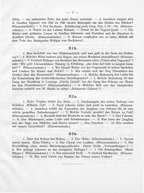 1. Was berichtet uns das Hildebrantslied, und was geht in der Seele der Helden vor?— 2. Welcher Mittel bedient sich Hagen, um seinen Mordplan auszuführen?(Klassen- aufsatz.)— 3. Verdient Rüdeger von Bechlarn den Beinamen eines„Vaters aller Tugenden“? oder: Wie geht Chriemhildens Ahnung in Erfüllung,„daz liebe mit leide ze jungest lonen kan“?(RKlassenaufsatz.)— 4. Wie kämpft Walter von der Vogelweide in seinen Sprüchen und Liedern für Kaiser und Reich?— 5. Wie erklärt sich der Sieg Klexanders des Großen über das Perserreich?(RKlassenaufsatz.)— 6. Welche Bedeutung hat Luther für die Entwicklung der neuhochdeutschen Schriftsprache?— 7. Welche Bedeutung für den Gang der Handlung in Lessings„Emilia Golotti“ hat der Gang des Prinzen zur Messe bei den Dominikanern?(Rlassenaufsatz.)— 8. Welches Bild von den kämpfenden Parteien entwirft uns W. Raabe in seiner„Schwarzen Galeere“?