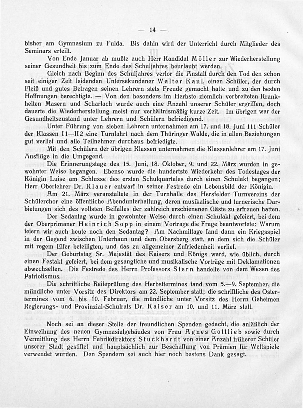 Gleich nach Beginn des Schuljahres verlor die Anstalt durch den Tod den schon seit einiger Zeit leidenden Untersekundaner Walter Kaul, einen Schüler, der durch Fleiß und gutes Betragen seinen Lehrern stets Freude gemacht hatte und zu den besten Hoffnungen berechtigte.— Von den besonders im Herbste ziemlich verbreiteten Krank- heiten Masern und Scharlach wurde auch eine Anzahl unserer Schüler ergriffen, doch dauerte die Wiederherstellung meist nur verhältnismäßig kurze Zeit. Im übrigen war der Gesundheitszustand unter Lehrern und Schülern befriedigend.