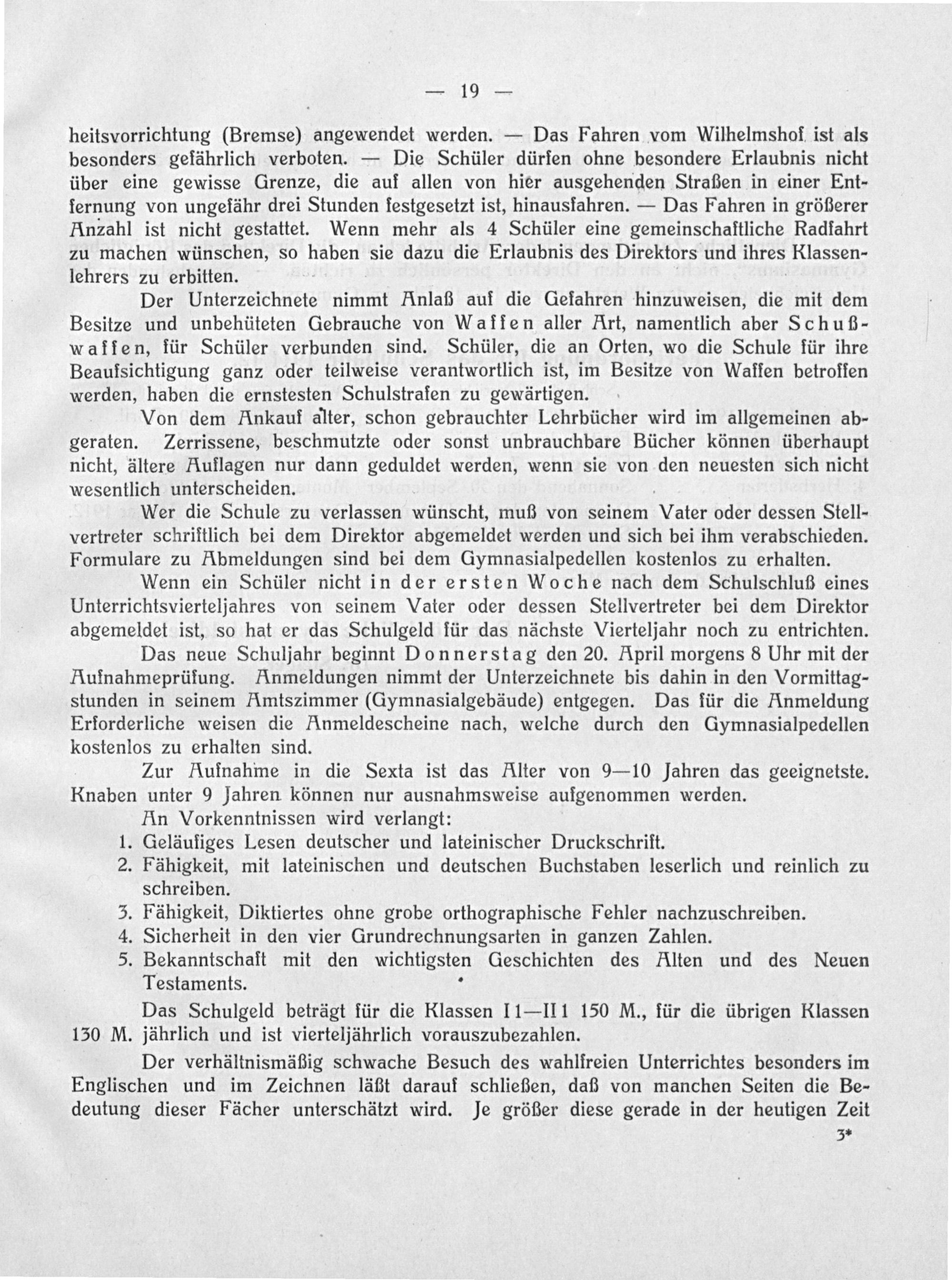 Das neue Schuljahr beginnt Donnerstag den 20. April morgens 8 Uhr mit der Aufnahmeprüfung. Anmeldungen nimmt der Unterzeichnete bis dahin in den Vormittag- stunden in seinem Amtszimmer(Gymnasialgebäude) entgegen. Das für die Anmeldung Erforderliche weisen die Anmeldescheine nach, welche durch den Gymnasialpedellen kostenlos zu erhalten sind.