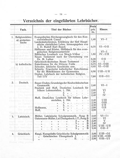 Preis Fach. Titel der Bücher. geb. Rlasse. Mk. 1. Religionslehre: Evangelisches Kirchengesangbuch für den Ron- a) protestan- sistorialbezirk Cassel 1,40 VII tische Landeskatechismus, Erklärung der fünt Haupt- stücke christlicher Lehre, herausgeseben von J. D. Rudolf Karl Busch 0,75 VI OII Halfmann und Köster, Hülfsbuch für den evan- gelischen Religionsunterricht 3 VI=SI Biblisches Lesebuch von Strack- Völker 1,80 IV— UII Neues Testament nach der Ubersetzung von Dr. M. Luther. 0,20 O II Griechisch-deutsches Neues Testament 1,00 I b) katholische. Ratechismus jür die Diözese Fulda 0,75 VI— OlIII Schuster, biblische Geschichte usw. 0,60 VI OIII Schmitz, Erweiterter katholischer Katechismus für die Mittelklassen der Gymnasien. 0,90 ͦUIII— UII Dreher, Lehrbuch der katholischen Keligion Teil I/IV. 7,60 OII OI 2—,————— 2. Deutsch. Bauer-Duden, Grundzüge der Neuhochdeutschen Grammatik..... 2,40 VISI Paulsiek und Muff, Deutsches Lesebuch für höhere Lehranstalten, 1. Abt. 2,00 VI * 2.„ 2,40 V „ 3.„.... 2,40 IV Muff, Deutsches Lesebuch für höhere Lehr- anstalten, 4. Abt... 2,40 UIII „ 5.„. 2,50 OlIII „ 6.„ 2,50 UII Hoffmann,» 7. 2,00 OII Muff,„ 8.„ 2,80 I 3. Lateinisch. Müller, Lateinische Schulgrammatik, Husg. B 2,60 VI II1 Ostermann-Müller, Lat. Obungsbuch. 1. T., Susg. B 1,60 VI „„„„ 2.„„ B 2,00 N „„„. 3.„„ B. 2,40 IV „ 18„„ 4.„„ B[2,00 UIII— UII . 9„„ 5.„„ B 5,00 O0 IIE1 4. GCGriechisch. Kaegi, Kurzgefaßte Griechische Sen erammalil 2,00% UIII OI „ Griechisches UÜbungsbuch I.. 1,80—UIII— OIII „„„ II. 2,00 OIII— UI