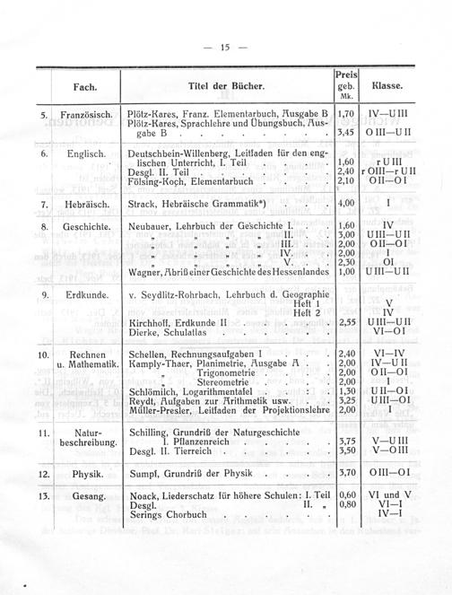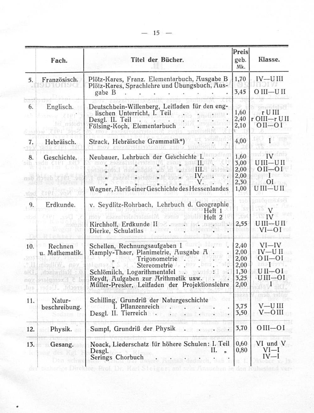 V Preis Fach. Titel der Bücher. geb. RKlasse. Mk. 5. Französisch. Plötz-Kares, Franz. Elementarbuch, Rusgabe B 1,70 IV— UIII Plõtz-Kares, Siraetebid und dUbungsbuch. Aus- gabe B. 3,45 OII-UII 6. Englisch. Deuischbein Willenberg, Leiltaden für dene neng- . lischen Unterricht, I. Teil 1,60 r UIII Desgl. II. Teil. 2,40 r OlIlr UII Fling Korh Elementarbuch 2,10 yOIILSOI 7. Hebräisch. Strack, Hebräische Grammatik⸗) 4,00 1 8. Geschichte. Neubauer, Lehrbuch der Geschichte I. 1,60 IV „„ 1„ II. 5,00 UIIl—UII „»„„ III. 2,00% yOII OI „„„„ IV. 2,00 1 „„„„ V...[2,30 01 Wagner, Abriß einer Geschichte des Hessenlandes 1,00 ßUIII—UII 9. Erdkunde. v. Seydlitz-Rohrbach, Lehrbuch d. Geographie. Heft 1 V Heft 2 IV Kirchhoff, Erdkunde II...[2,55 UIII— UII Dierke, Schulatlas VIO OI 10. Rechnen Schellen, RecSgsaufgaben F.. 2,40 VI=IV u. Mathematik. Ramply-Thaer, Planimetrie, Ausgabe 1. 2,00 V-UII „ Trigonometrie. 2,00 yOII— Ol Stereometrie 2,00 J Schlömilch, Logarithmentaſel. 1,50 yUII Ol Reydt, Kufgaben zur Krithmetik usw.. 3,25 UIII Ol Müller-Presler, Leitfaden der Projektionslehre 2,00 1 11. Natur- Schilling, Grundriß der Naiiicereichate beschreibung. I. Pflanzenreich. 3,75 V-UIII Desgl. II. Tierreich 50 V OlIII 12 puysit Sumpf, Grundriß der Physik 3,70 0m- on 13. Gesang. Noack, Liederschatz für höhere Schulen: I. Teil 0,60 VI un V Desgl. II.„ 0,80 VI=I Serings Chorbuch.... IV=I