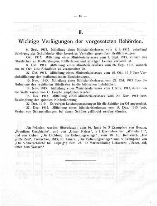 An Prämien wurden überwiesen: zum 16. Juni: je 3 Exemplare von Herzog, „Preußens Geschichte“, und von„Unser Kaiser“, je 2 Exemplare von„Wilhelm II.“, und von Ziehen„Die Dichtung der Befreiungskriege“; zum 18. 10.: Rethwisch,„Die große Zeit“, Treitschke, 1813, K. Tanera,„Die Befreiungskriege“ und 5 Exemplare von „Die Völkerschlacht bei Leipzig“; zum 27. I.: Marinealbum; Leberecht,„Ueber, auf, unter dem Wasser.“