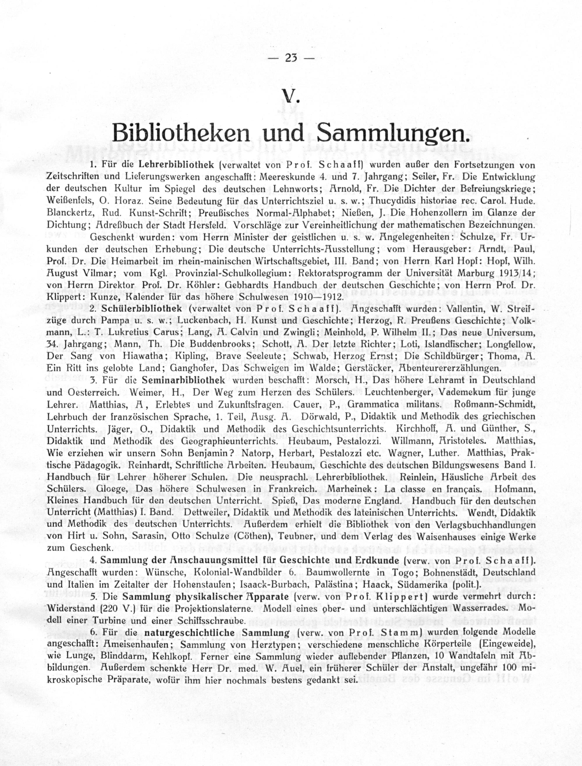 Geschenkt wurden: vom Herrn Minister der geistlichen u. s. w. Angelegenheiten: Schulze, Fr. Ur- kunden der deutschen Erhebung; Die deutsche Unterrichts-Kusstellung; vom Herausgeber: Arndt, Paul, Prof. Dr. Die Heimarbeit im rhein-mainischen Wirtschaftsgebiet, III. Band; von Herrn Karl Hopf: Hopl, Wilh. August Vilmar; vom Rqgl. Provinzial-Schulkollegium: Rektoratsprogramm der Universität Marburg 19135/14; von Herrn Direktor Prof. Dr. Köhler: Gebhardts Handbuch der deutschen Geschichte; von Herrn prof. Dr. Klippert: Kunze, Kalender für das höhere Schulwesen 1910— 1912.