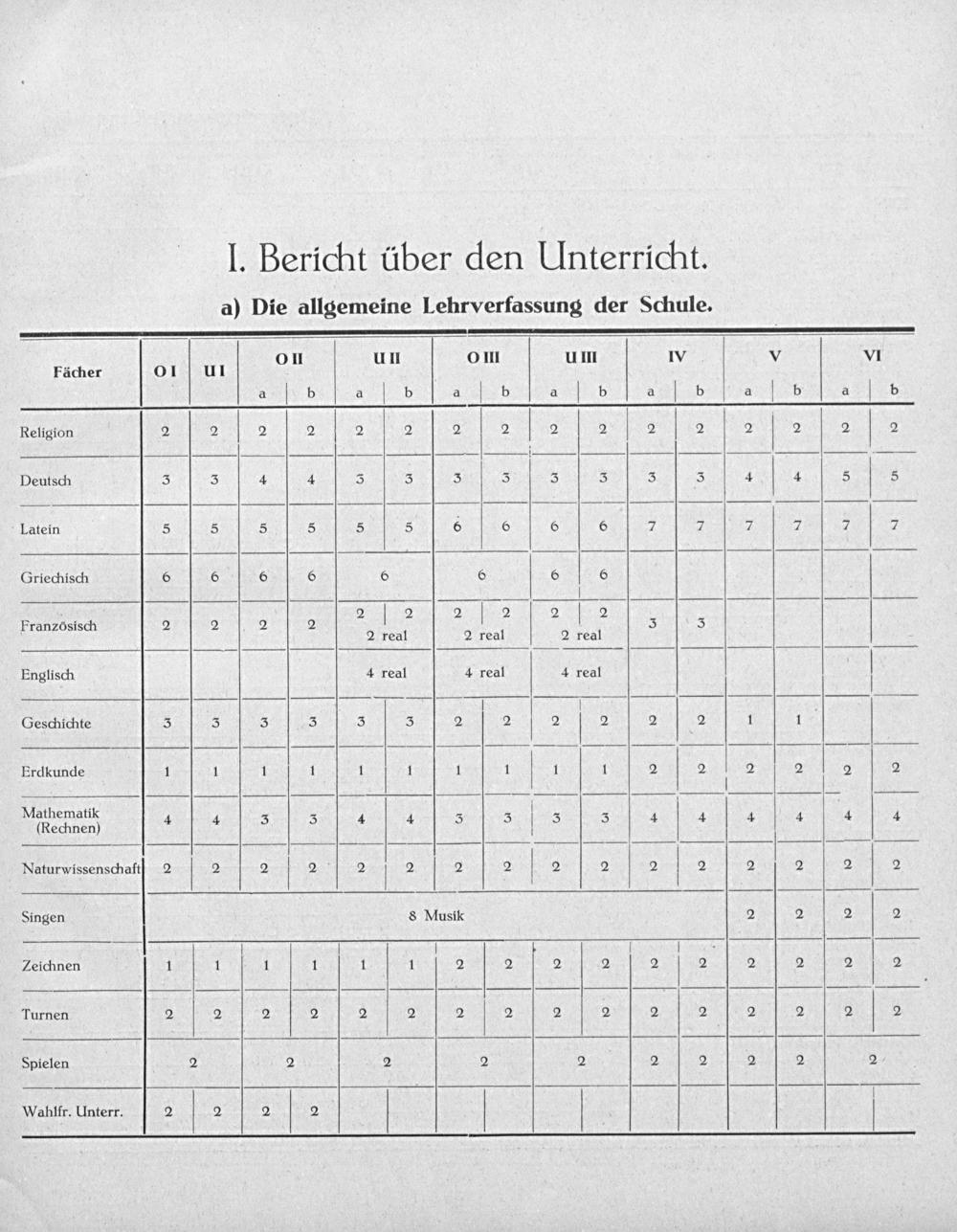 —— 0 II UII O III UIII IV Fächer 01 UI a b a b a b a b a b Religion 9 2 2 2 2 2 2 2 2 2 2 2 Deutsch 3 3 4 4 3 3 3 3 3 3 3 3 Latein 5 5 5 5 5 5 6 6 0 6 7 7 Griechisch 6 6 6 6 6 6 6 6 . 2 2 2 2 2 2 Franzöôsisch 2 2 2 2 5 3 2 real 2 real 2 real Englisch 4 real 4 real 4 real Geschichte 3 3 3 5 3 3 2 2 2 2 2 2 Erdkunde 1 1 1 1 1 1 1 1 1 1 2 2 Mathematik 3 Rechnen) 4 4 3 5 4 4 5 3 5 3 4 4 Naturwissenschaftt 2 2 2 2 2 2 2 2 2 2 2 2 Singen 8 Musik —. Zeichnen 1 1 1 1 1 1 2 2 2 2 2 2 Turnen 2 2 2 2 2 2 2 2 2 2 2 2 Spielen 2 2 2 2 2 2 2 Wahlfr. Unterr. 2 V 2 2 V 2 V V