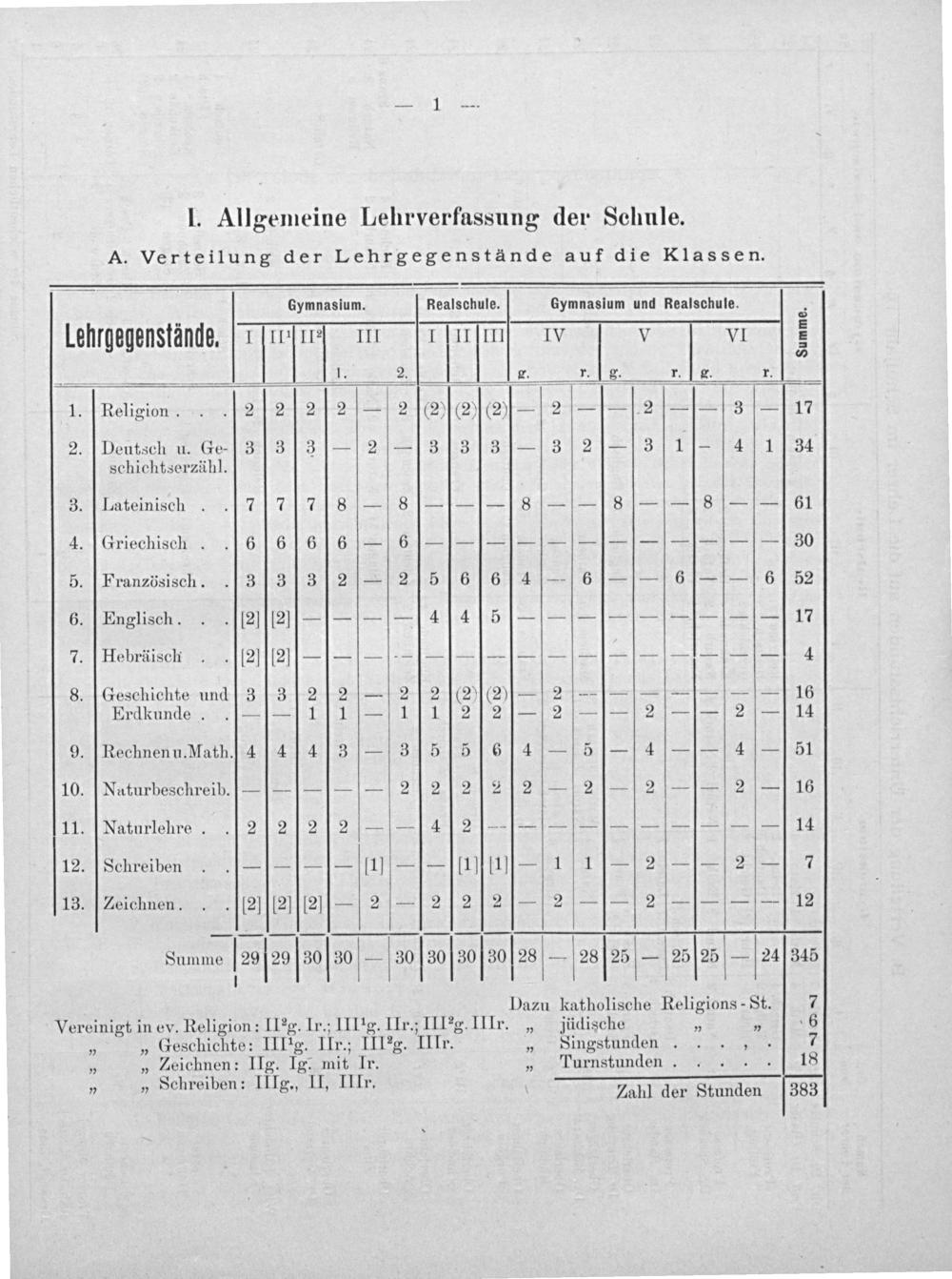gymnasium. Realschule. Gymnastum und Realschute. 6 Lehrgegenstände. ſ=iE E ſTſIIIſ F V 5 —— 4.— 2. 4———— 1. Religion. 2 2i1 2 1 2— 2[(2)(2)(2)1- 2——.2——J— 3— 17 2. Deutsch u. Ge- 3 1 3/ 31— 2—3[3[3— 3 2— 3 1- 4 1 34 schichtserzähl. 3. Lateinisch 77178—8——S——8s——8—— 61 4. Griechisch. 6[1[6[16[16— 6——ℳõ—--——ℳhꝛ———— 30 5. Französisch. 3 331 2— 2[15[6 16 4— 6°[—— 6—— 6 52 6. Englisch.[21Pl2l1- 1-—-— 4 4 55-———-—-——-——— 17 7. Hebräisch[211211—--—--d—4 8. Geschichte und 31 31 21 2— 2[2[(2)[(2) 1 2—-—-———-—— 16 Erdkunde.—— 11 1— 11 1 ⁄[2 12—6 2—— 2—— 2— 14 9.[Rechnen u. Math. 4 4 4 3— 3 51 51 61 4— 5— 4—— 4— 51 10. Naturbeschreib.———-— 21 21 2 1 22—— 2 1— 2—— 2— 16 11. Naturlehre. 2 21 2 2——[4 2—-—6———————— 14 12. Schreiben———— Iu— liti- 1 1 2— Z= 2— 7 13. Zeichnen.[2]II2llell-2—[2 21 2 1- 2—6 2-——- 12 Summe[29[29 30 30— 30[30 30[30[28— 28 ˙[25— 25 25— 24 345 — Dazu katholische Religions-St. 7 Vereinigt in ev. Religion: IIg. Ir.; IIIig. IIr.; III?g. IIIr.„ jüdische„ 6 „„ Geschichte: IIIig. IIr.; III²g. IIIr.„ Singstunden...„ 7 „„ Zeichnen: IIg. Ig. mit Ir.„ Turnstunden. 18 „„ Schreiben: IIIg., II, IIIr. Z der Stunden 383