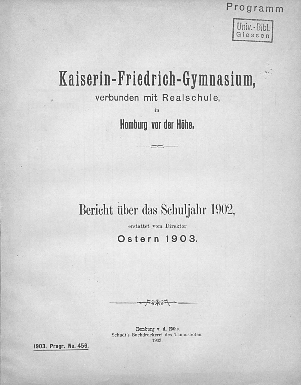 Homburg v. d. Höôhe. Schudt's Buchdruckerei des Taunusboten. 1903. 1903. Progr. No. 456.