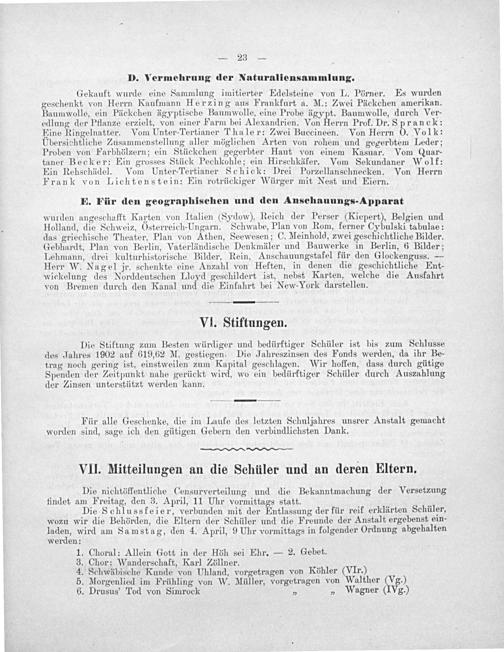 Für alle Geschenke, die im Laufe des letzten Schuljahres unsrer Anstalt gemacht worden sind, sage ich den gütigen Gebern den verbindlichsten Dank.