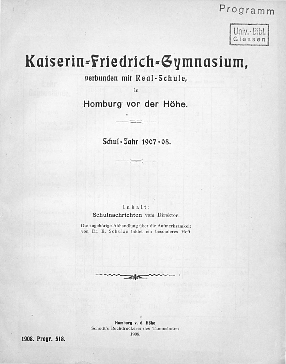 Homburg v. d. Höhe Schudt’s Buchdruckerei des Taunusboten 1908.
