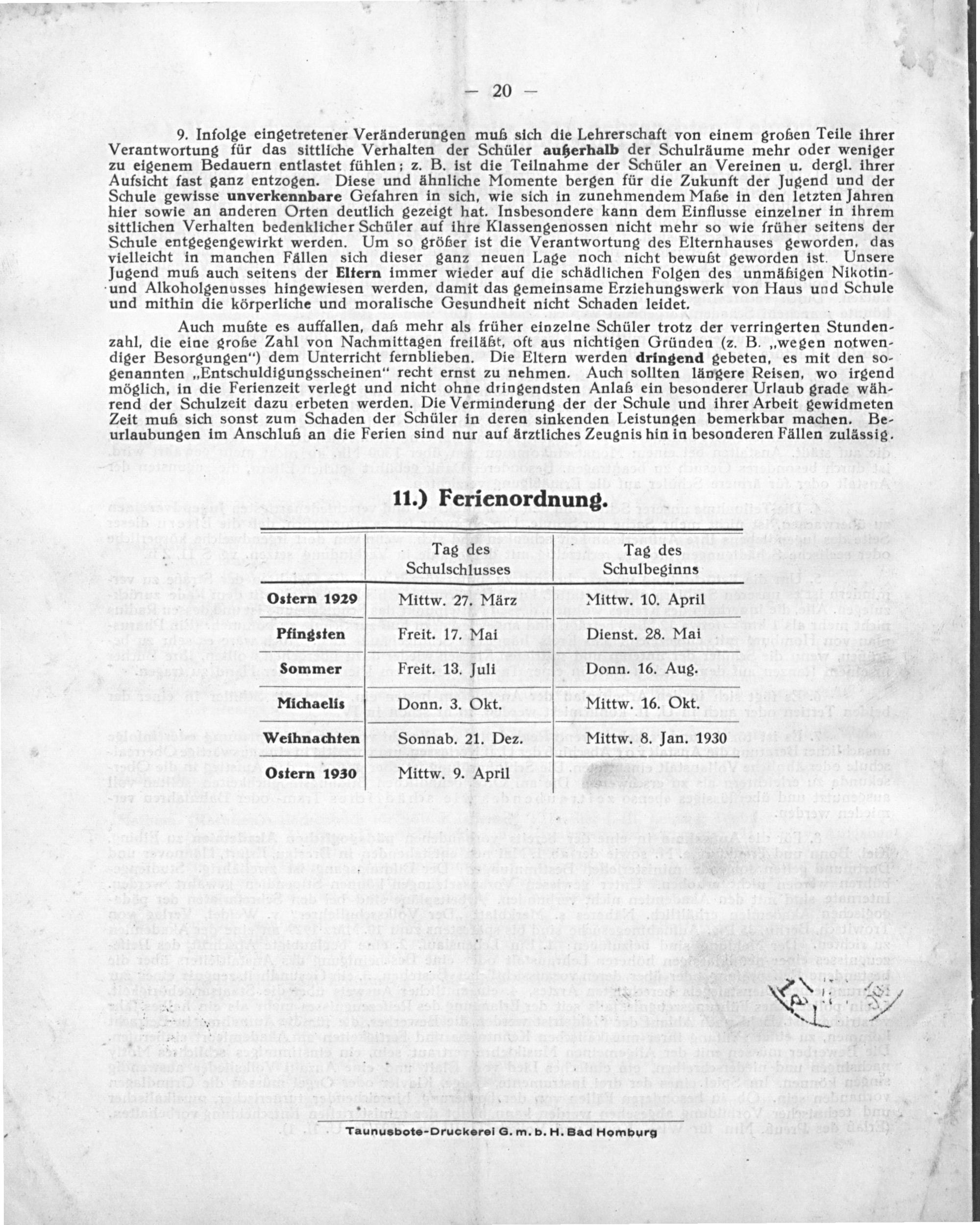9. Infolge eingetretener Veränderungen muß sich die Lehrerschaft von einem großen Teile ihrer Verantwortung für das sittliche Verhalten der Schüler außerhalb der Schulräume mehr oder weniger zu eigenem Bedauern entlastet fühlen; z. B. ist die Teilnahme der Schüler an Vereinen u. dergl. ihrer Aufsicht fast ganz entzogen. Diese und ähnliche Momente bergen für die Zukunft der Jugend und der Schule gewisse unverkennbare Gefahren in sich, wie sich in zunehmendem Maße in den letzten Jahren hier sowie an anderen Orten deutlich gezeigt hat. Insbesondere kann dem Einflusse einzelner in ihrem sittlichen Verhalten bedenklicher Schüler auf ihre Klassengenossen nicht mehr so wie früher seitens der Schule entgegengewirkt werden. Um so größer ist die Verantwortung des Elternhauses geworden, das vielleicht in manchen Fällen sich dieser ganz neuen Lage noch nicht bewußt geworden ist. Unsere Jugend muß auch seitens der Eltern immer wieder auf die schädlichen Folgen des unmäßigen Nikotin- und Alkoholgenusses hingewiesen werden, damit das gemeinsame Erziehungswerk von Haus und Schule und mithin die körperliche und moralische Gesundheit nicht Schaden leidet.