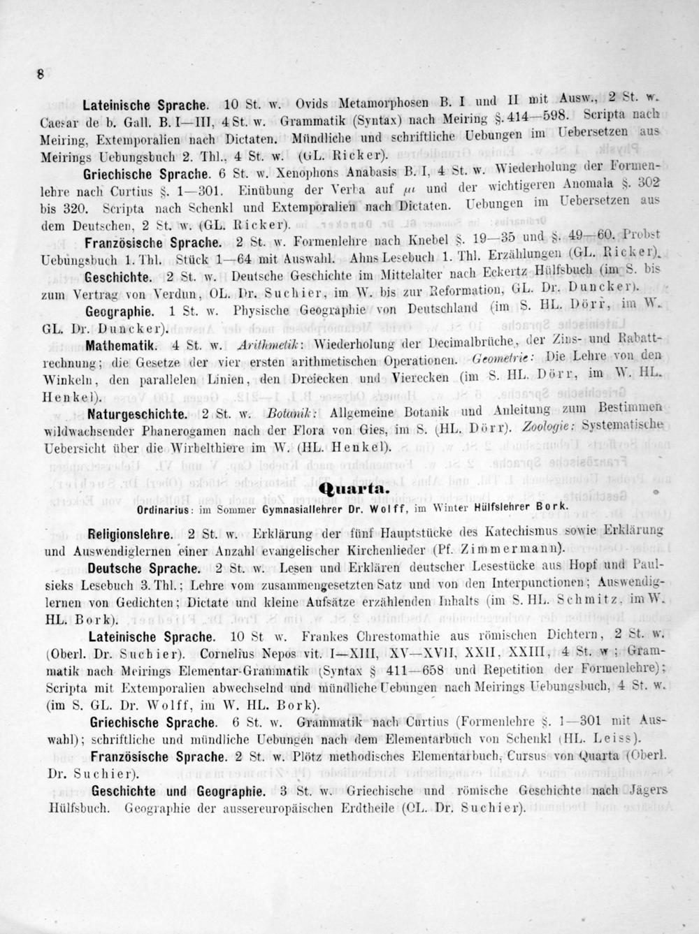 Quarta. Ordinarius: im Sommer Gymnasiallehrer Dr. Wolff, im Winter Hülfslehrer Bork.