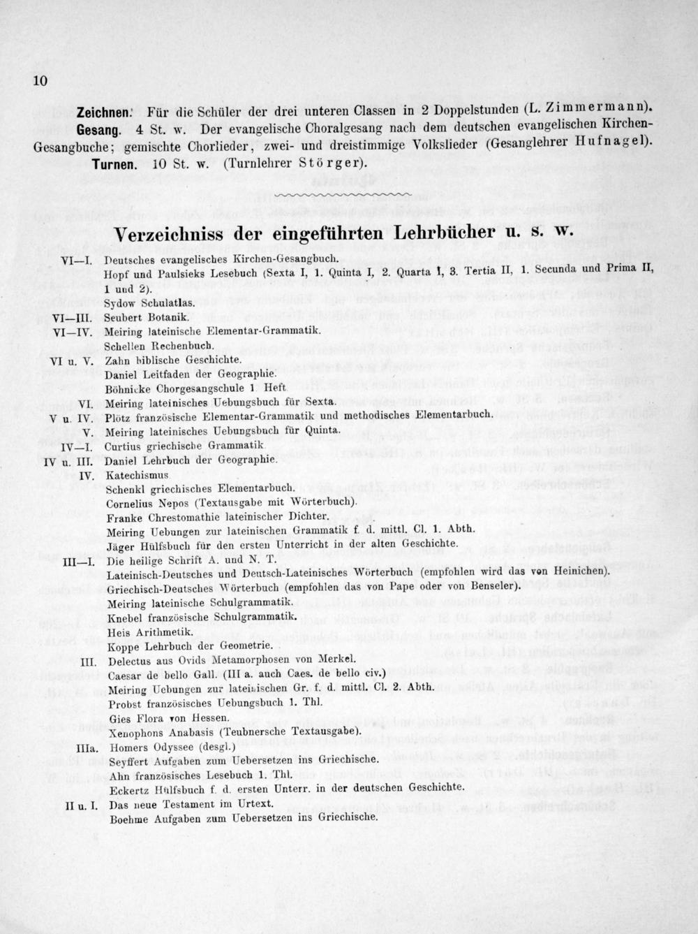 VI— I. Deutsches evangelisches Kirchen-Gesangbuch. Hopf und Paulsieks Lesebuch(Sexta I, 1. Quinta I, 2. Quarta 1, 3. Tertia II, 1. Secunda und Prima II, 1 und 2). 3 Sydow Schulatlas. VI III. Seubert Botanik. VI- IV. Meiring lateinische Elementar-Grammatik. Schellen Rechenbuch. VI u. V. Zahn biblische Geschichte. Daniel Leitfaden der Geographie. Böhnicke Chorgesangschule 1 Heft VI. Meiring lateinisches Uebungsbuch für Sexta. V u. IV. Plötz französische Elementar-Grammatik und methodisches Elementarbuch. V. Meiring lateinisches Uebungsbuch für Quinta. IV— I. Curtius griechische Grammatik IV u. III. Daniel Lehrbuch der Geographie. IV. Katechismus Schenkl griechisches Elementarbuch. Cornelius Nepos(Textausgabe mit Wörterbuch). Franke Chrestomathie lateinischer Dichter.. Meiring Uebungen zur lateinischen Grammatik f. d. mittl. Cl. 1. Abth. Jäger Hülfsbuch für den ersten Unterricht in der alten Geschichte. III— I. Die heilige Schrift A. und N. T. Lateinisch-Deutsches und Deutsch-Lateinisches Wörterbuch(empfohlen wird das von Heinichen). Griechisch-Deutsches Wörterbuch(empfohlen das von Pape oder von Benseler). Meiring lateinische Schulgrammatik. Knebel französische Schulgrammatik. Heis Arithmetik. Koppe Lehrbuch der Geometrie. III. Delectus aus Ovids Metamorphosen von Merkel. Caesar de bello Gall.(III a. auch Caes. de bello civ.) Meiring Uebungen zur lateivischen Gr. f. d. mittl. Cl. 2. Abth. Probst französisches Uebungsbuch 1. Thl. Gies Flora von Hessen. Xenophons Anabasis(Teubnersche Textausgabe). IIIa. Homers Odyssee(desgl.) Seyffert Aufgaben zum Uebersetzen ins Griechische. Ahn französisches Lesebuch 1. Thl. Eckertz Hulfsbuch f. d. ersten Unterr. in der deutschen Geschichte. II u. I. Das neue Testament im Urtext. Boehme Aufgaben zum Uebersetzen ins Griechische.