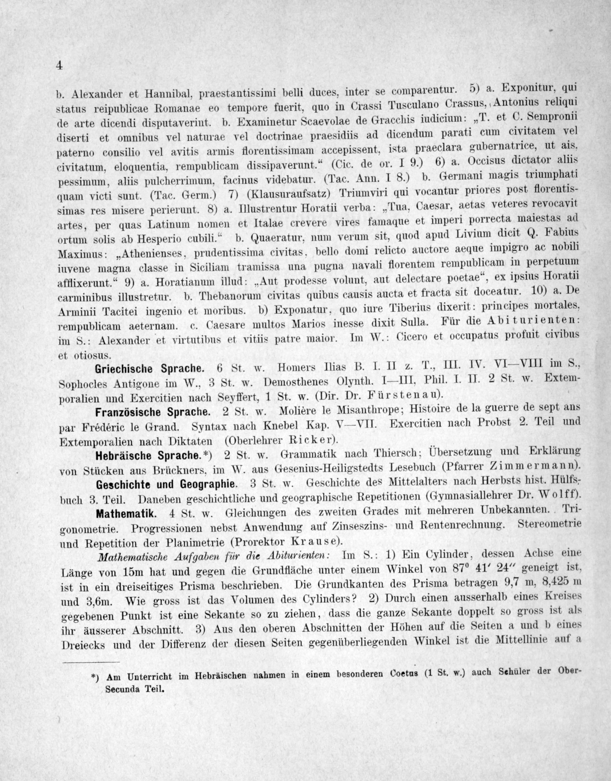 Hebräische Sprache.*) 2 St. w. Grammatik nach Thiersch; Übersetzung und Erklärung von Stücken aus Brückners, im W. aus Gesenius-Heiligstedts Lesebuch(Pfarrer Zimmermann).