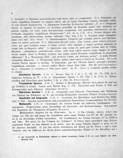 Mathematik. 4 St. w. Gleichungen des zweiten Grades mit mehreren Unbekannten. Tri- gonometrie. Progressionen nebst Anwendung auf Zinseszins- und Rentenrechnung. Stereometrie und Repetition der Planimetrie(Prorektor Krause).
