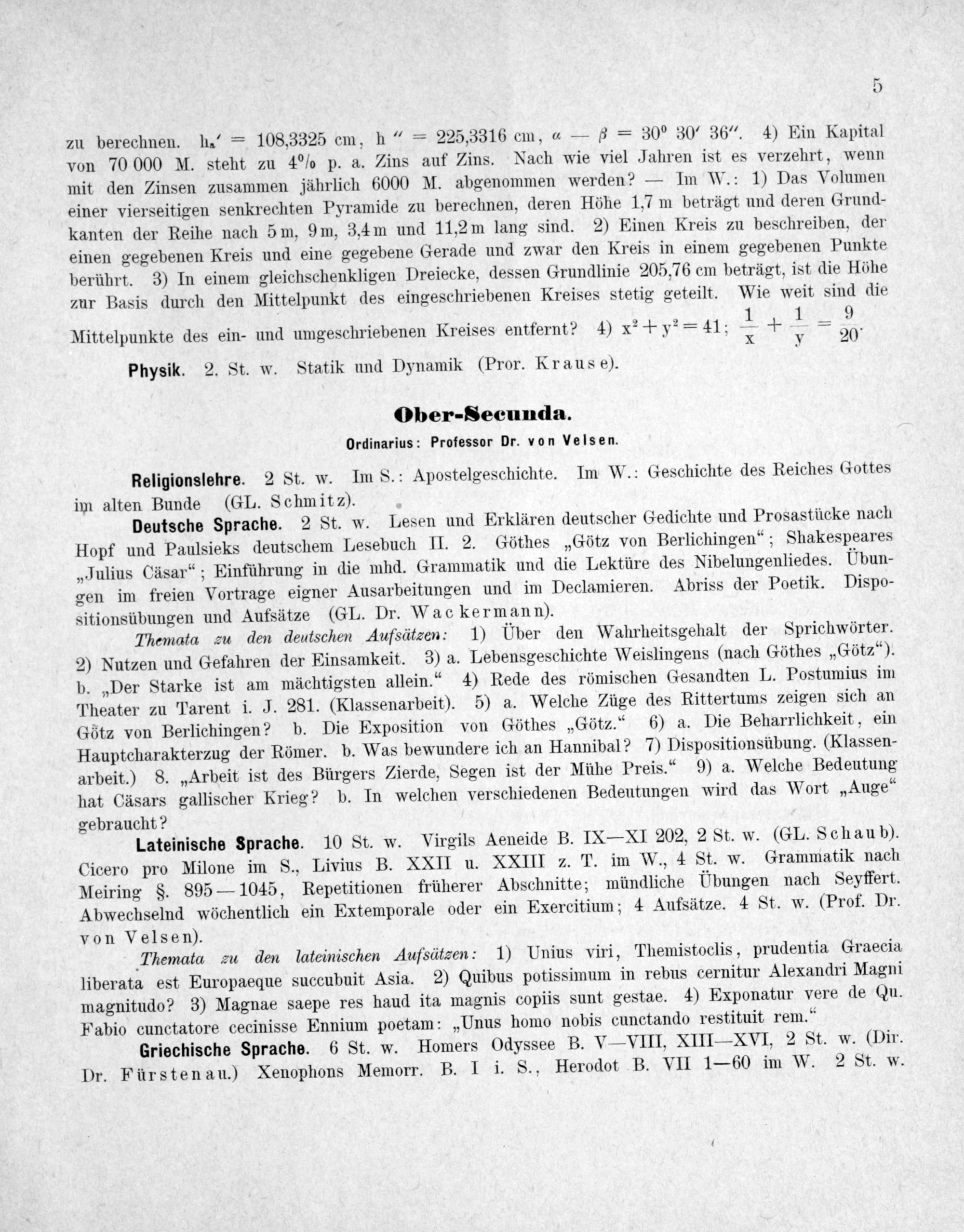 Lateinische Sprache. 10 St. w. Virgils Aeneide B. IX XI 202, 2 St. w.(GL. Schau b). Cicero pro Milone im S., Livius B. XXII u. XXIII z. T. im W., 4 St. w. Grammatik nach Meiring§. 895— 1045, Repetitionen früherer Abschnitte; mündliche Übungen nach Seyffert. Abwechselnd wöchentlich ein Extemporale oder ein Exercitium; 4 Aufsätze. 4 St. w.(Prof. Dr. von Velsen).