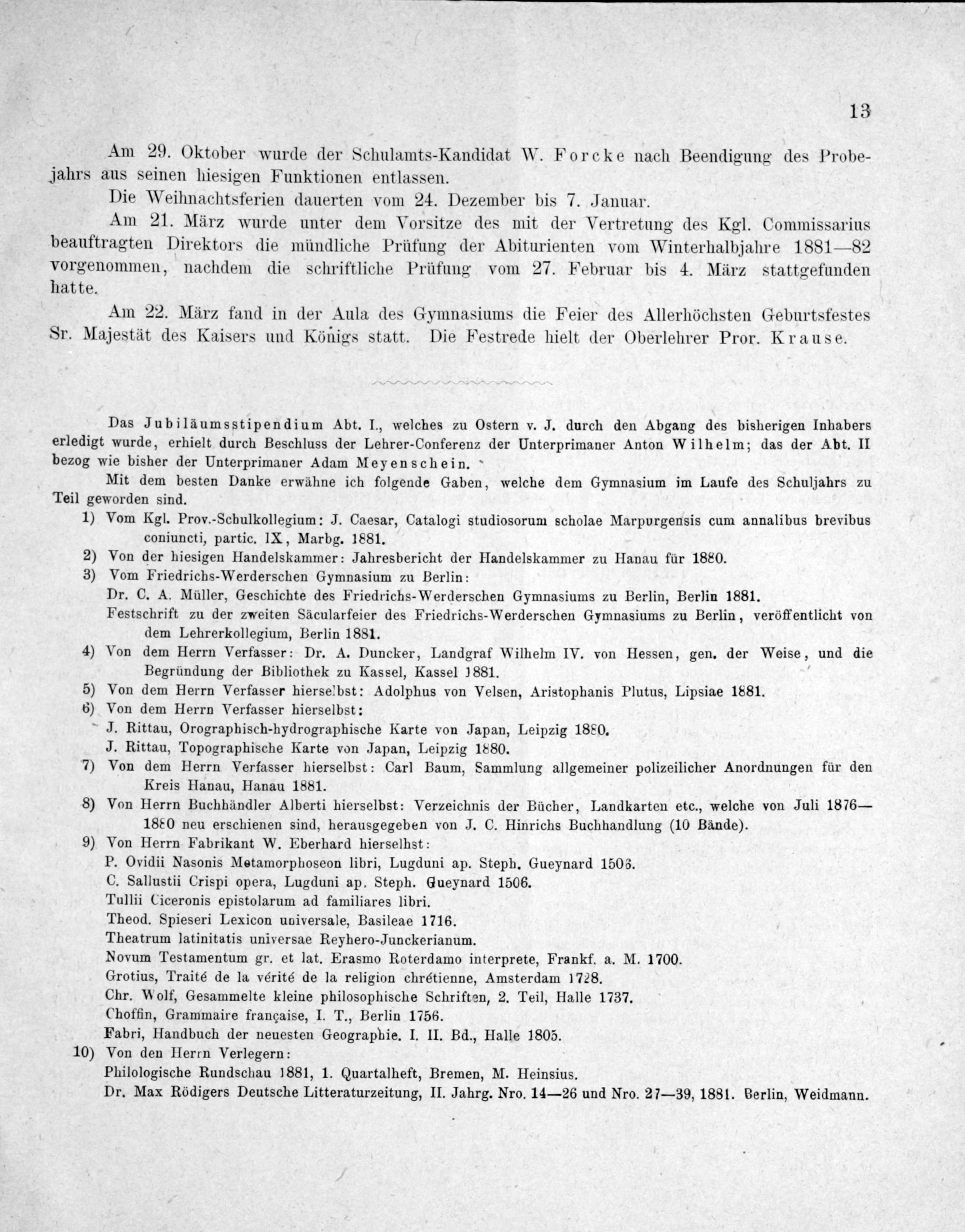 1) Vom Kgl. Prov.-Schulkollegium: J. Caesar, Catalogi studiosorum scholae Marpurgensis cum annalibus brevibus coniuncti, partic. IX, Marbg. 1881. 2) Von der hiesigen Handelskammer: Jahresbericht der Handelskammer zu Hanau für 1880. 3) Vom Friedrichs-Werderschen Gymnasium zu Berlin: Dr. C. A. Müller, Geschichte des Friedrichs-Werderschen Gymnasiums zu Berlin, Berlin 1881. Festschrift zu der zweiten Säcularfeier des Friedrichs-Werderschen Gymnasiums zu Berlin, veröffentlicht von dem Lehrerkollegium, Berlin 1881. 4) Von dem Herrn Verfasser: Dr. A. Duncker, Landgraf Wilhelm IV. von Hessen, gen. der Weise, und die Begründung der Bibliothek zu Kassel, Kassel 1881. 5) Von dem Herrn Verfasser hierselbst: Adolphus von Velsen, Aristophanis Plutus, Lipsiae 1881. 6) Von dem Herrn Verfasser hierselbst: J. Rittau, Orographisch-hydrographische Karte von Japan, Leipzig 1880.