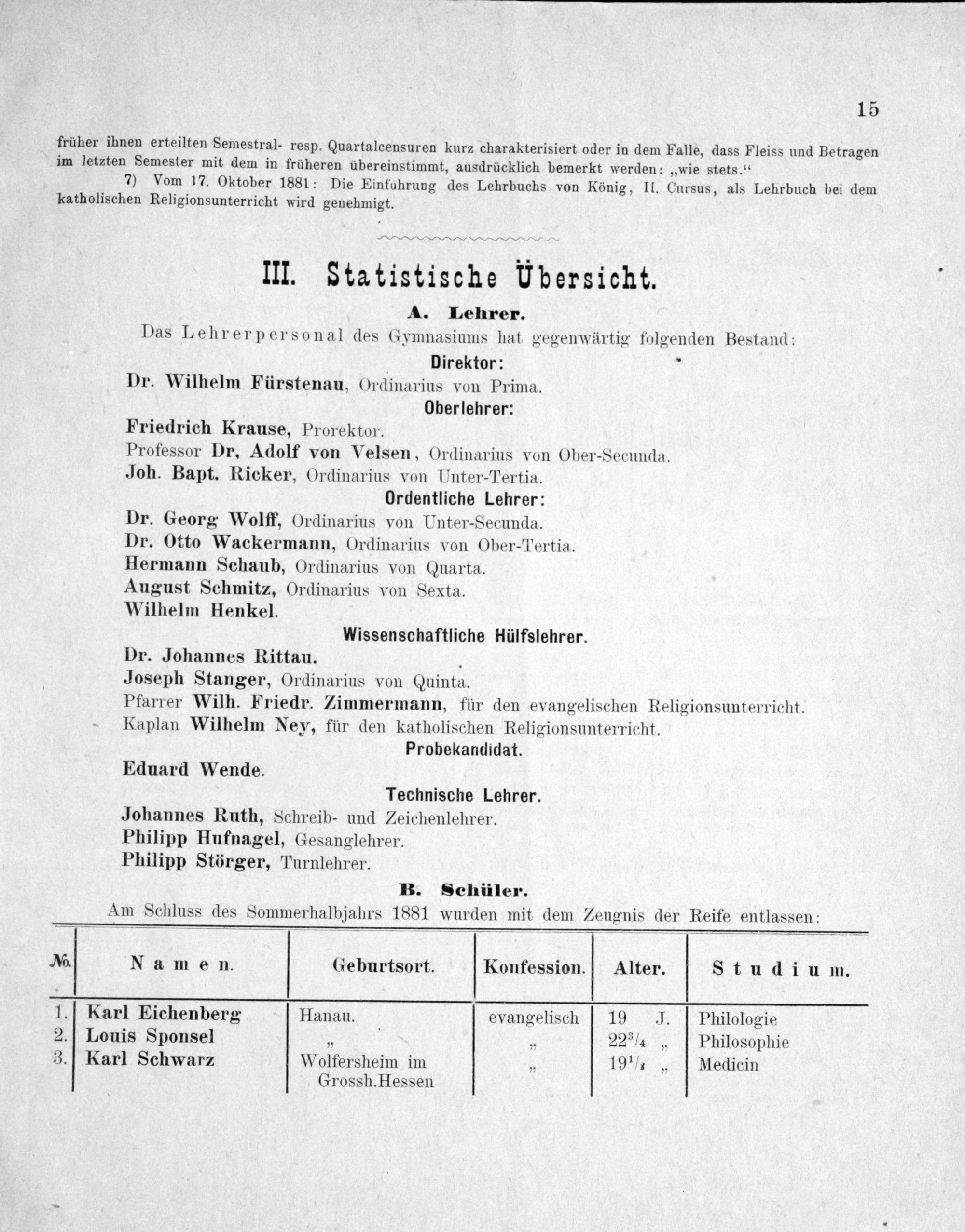 Am Schluss des Sommerhalbjahrs 1881 wurden mit dem Zeugnis der Reife entlassen: