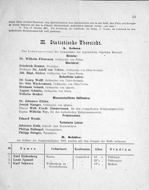 No Namen. Geburtsort. Konfession. Alter. Studium. 1. Karl Eichenberg Hanau. evangelischt 19 J. RPhilologie 2. Louis Sponsel.„ 22 ¾„ Philosophie 3. Karl Schwarz Wolfersheim im„ 19 ½„ Medicin Grossh. Hessen