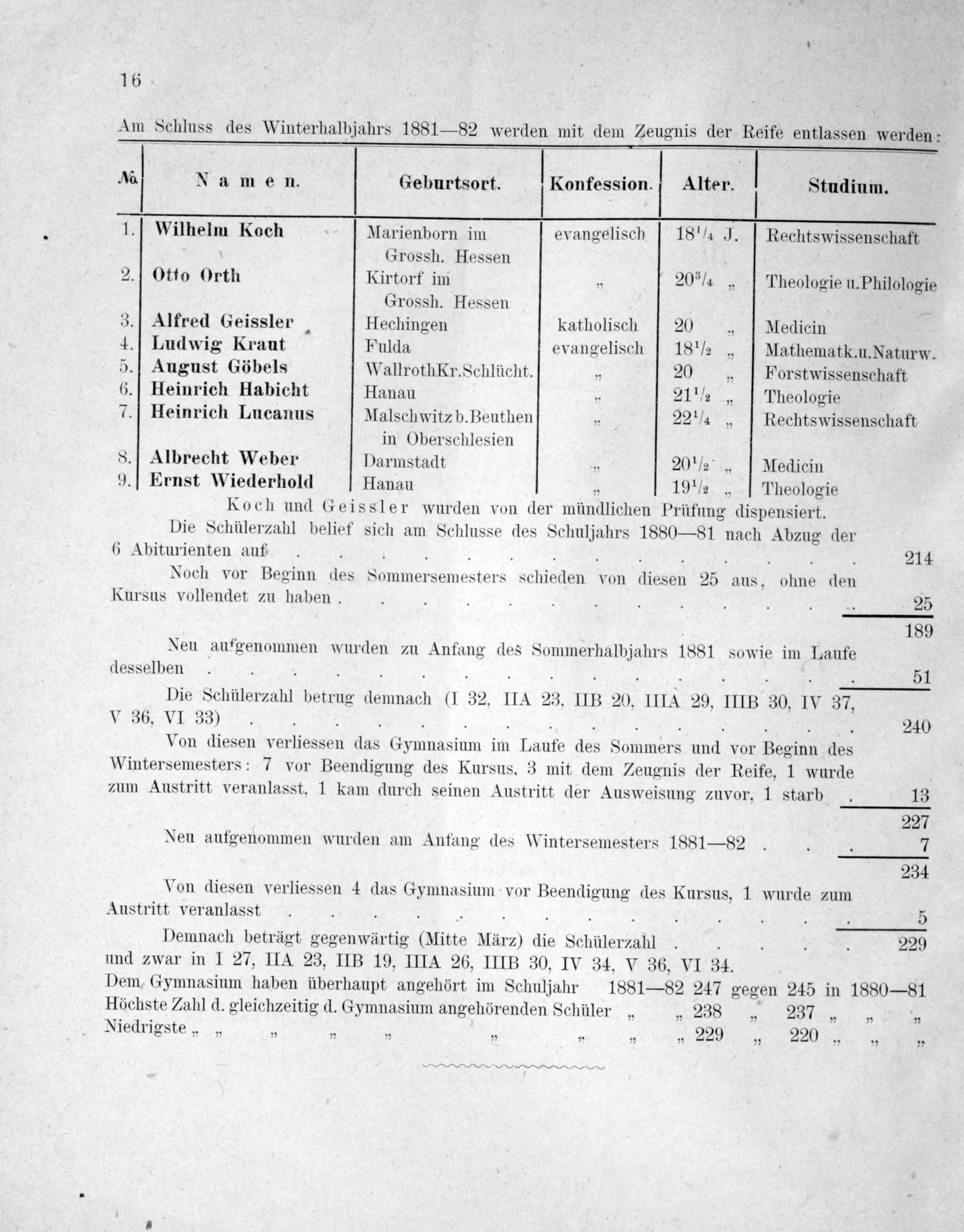 Ao Namen. Geburtsort. Konfession. Alter. Studium. 1. Wilhelm Koch Marienborn im evangelisch—18 ¼ J. Rechtswissenschaft Grossh. Hessen 2. Otto Orth Kirtorf im 20 ¾ Theologie u. Philologie Grossh. Hessen 3. Alfred Geissler, Hechingen katholisch 20 Medicin 4. Ludwig Kraut Fulda evangelisch 18 ½ Mathematk. u. Naturw. 5. August Göbels WallrothKr. Schlücht. 20„ Forstwissenschaft 6. Heinrich Habicht Hanau 21 ½„ Theologie 7. Heinrich Lucanus Malschwitz b. Beuthen 22 ¼ Rechtswissenschaft in Oberschlesien 8. Albrecht Weber Darmstadt 20 ½„ Medicin 9.] Ernst Wiederhold Hanau„ 19 ½ Theologie Koch und Geissler wurden von der mündlichen Prüfung dispensiert. Die Schülerzahl belief sich am Schlusse des Schuljahrs 1880— 81 nach Abzug der 6 Abiturienten auf...... 3....... 214 Noch vor Beginn des Sommersemesters schieden von diesen 25 aus, ohne den Kursus vollendet zu haben.....—..... 3 25 189 Neu aufgenommen wurden zu Anfang des Sommerhalbjahrs 1881 sowie im Laufe desselben.. 7. 1......... 3 51 Die Schülerzahl betrug demnach(I 32, IIA 23, IIB 20. IIIA 29, IIIB 30, IV 37, V 36, VI 33)............. 240 Von diesen verliessen das Gymnasium im Laufe des Sommers und vor Beginn des Wintersemesters: 7 vor Beendigung des Kursus. 3 mit dem Zeugnis der Reife, 1 wurde zum Austritt veranlasst. 1 kam durch seinen Austritt der Ausweisung zuvor, 1 starb. 13 227 Neu aufgenommen wurden am Anfang des Wintersemesters 1881— 82... 7 234