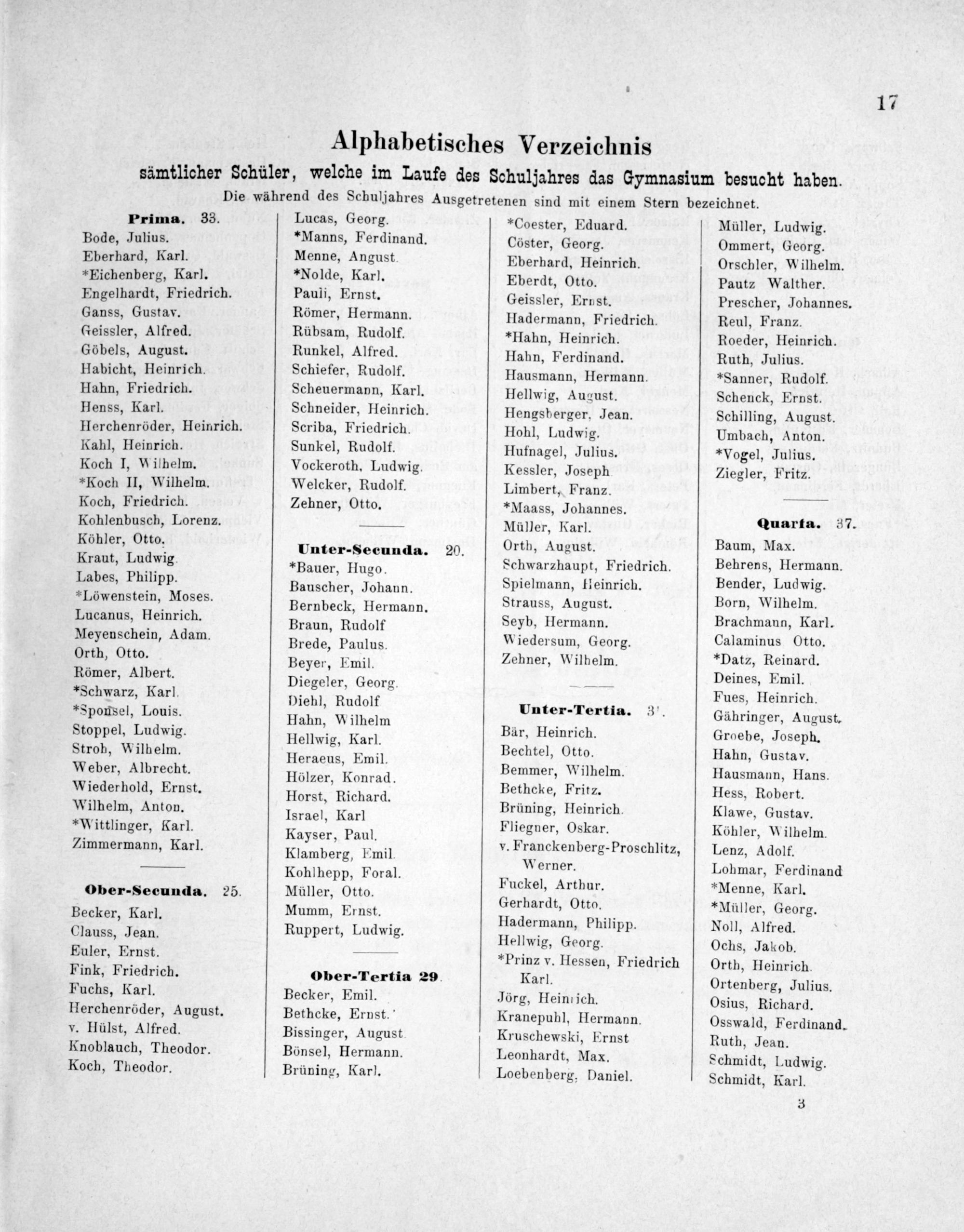 Prima. 33. Bode, Julius. Eberhard, Karl. *Eichenberg, Karl. Engelhardt, Friedrich. Ganss, Gustav. Geissler, Alfred. Göbels, August. Habicht, Heinrich. Hahn, Friedrich. Henss, Karl. Herchenröder, Heinrich. Kahl, Heinrich. Koch I, Wilhelm. *Koch II, Wilhelm. Koch, Friedrich. Kohlenbusch, Lorenz. Köhler, Otto. Kraut, Ludwig. Labes, Philipp. Löwenstein, Moses. Lucanus, Heinrich. Meyenschein, Adam. Orth, Otto. Römer, Albert. *Schwarz, Karl, *Sponsel, Louis. Stoppel, Ludwig. Stroh, Wilhelm. Weber, Albrecht. Wiederhold, Ernst. Wilhelm, Anton. *Wittlinger, Karl. Zimmermann, Karl.