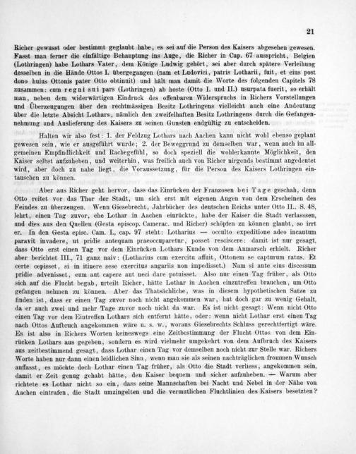 Richer gewusst oder bestimmt geglaubt habe, es sei auf die Person des Kaisers abgesehen gewesen. Fasst man ferner die einfältige Behauptung ins Auge, die Richer in Cap. 67 ausspricht, Belgien (Lothringen) habe Lothars Vater, dem Könige Ludwig gehört, sei aber durch spätere Verleihung desselben in die Hände Ottos I. übergegangen(nam et Ludovici, patris Lotharii, fuit, et eius post dono huius Ottonis pater Otto obtinuit) und hält man damit die Worte des folgenden Capitels 78 zusammen: cum regni sui pars(Lothringen) ab hoste(Otto I. und II.) usurpata fuerit, so erhält man, neben dem widerwärtigen Eindruck des offenbaren Widerspruchs in Richers Vorstellungen und Überzeugungen über den rechtmässigen Besitz Lothringens vielleicht auch eine Andeutung über die letzte Absicht Lothars, nämlich den zweifelhaften Besitz Lothringens durch die Gefangen- nehmung und Auslieferung des Kaisers zu seinen Gunsten endgültig zu entscheiden.