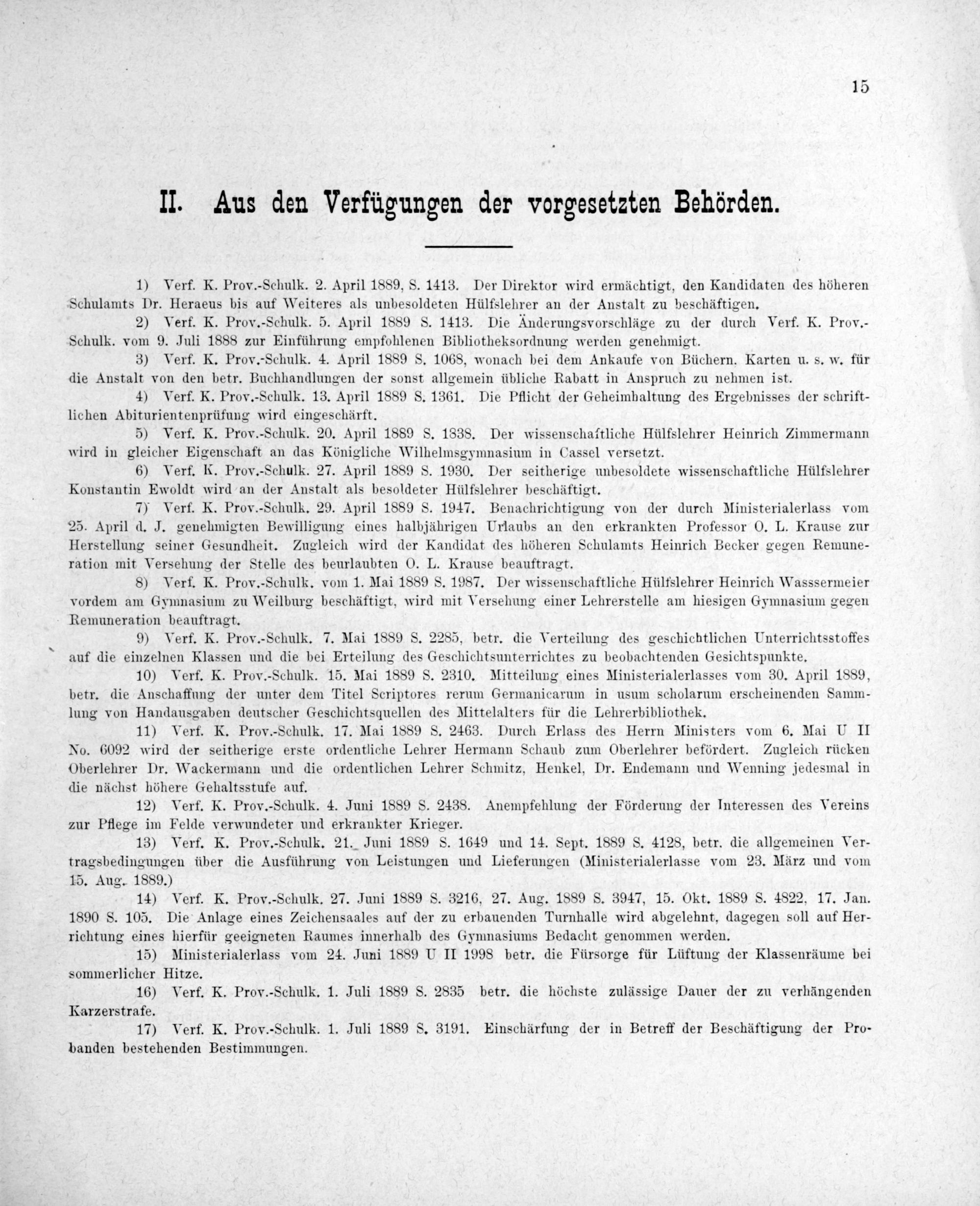 5) Verf. K. Prov.-Schulk. 20. April 1889 S. 1838. Der wissenschaftliche Hülfslehrer Heinrich Zimmermann wird in gleicher Eigenschaft an das Königliche Wilhelmsgymnasium in Cassel versetzt.