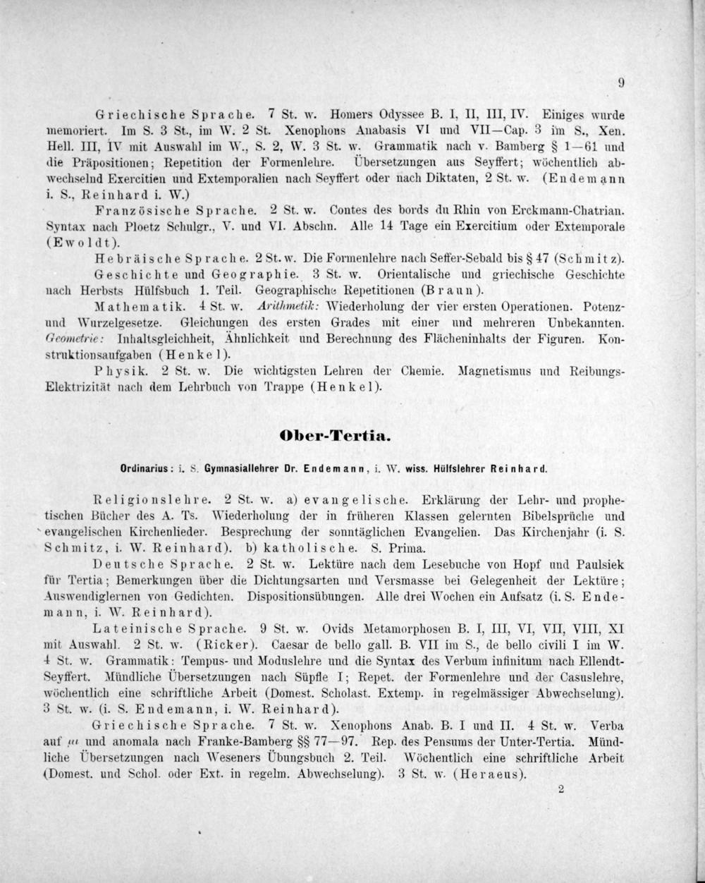 Ordinarius: i. S. Gymnasiallehrer Dr. Endem ann, i. W. wiss. Hülfslehrer Reinhard.