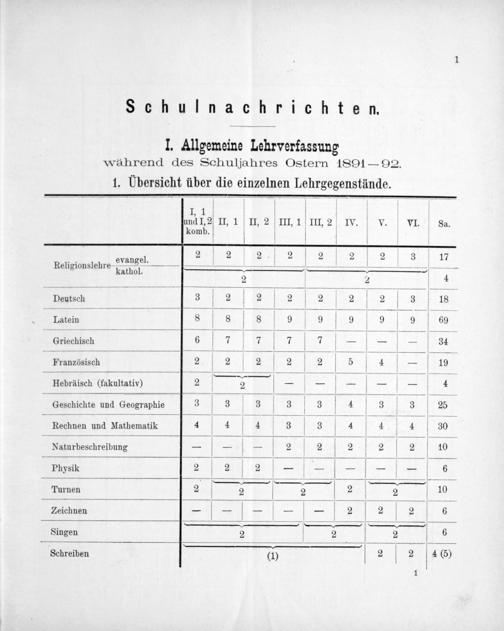 al 12 II, 1 n. 2 III, 1 V III, 2 IV. V V. VI. V Sa 1nö. 2 2 2 2 2 2 3 1⸗ , evangel. Religionslehre—=——,,— kathol. 1 2 2 —QQQ—Q—Q————— Deutsch 3 V 2 V 2 V 2 2 2 V 2 3 V 18 Latein 8 8 V 8 V 9 9 V 9 9 9 9 —— V Griechisch 6 V 7 7 7 7 V—-———— 34 5 Französisch 2 V 2 2 2 I 2 V 5 4— 19 .—— V Hebräisch(fakultativ) 2d 2+———-— 4 V V V 9 Geschichte und Geographie 3 3 3 3 V 3 4 V 3 V 3 V 25 —— Rechnen und Mathematik 4 4 V 4 3 V 3 4 4 V 4 30 Naturbeschreibung—— V— 2 2 2 V 2 V 2 10 Physik 2 2 12==I== 7 ſ„ G ſ·ʒ·ʒʒO— Turnen 2 I 2 V 2 2 V 2 10 Zeichnen——— V—— 2 2 V 2 6 Singen 2 2 2 6 Schreiben(0) 2 V 2 4(5)
