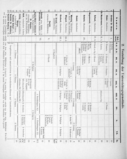 Ordi-.. Namen. nariat I. 1. I. 2. II. 1. 11. 2. 111. 1. Imn. 2. LVV. 1. VI.. 2 Latein 2 4 113 1 Dirotor Dr. Braun. 6 Griechisch 5 Latein—12 Ricker, Oberlehrer. 2 Französ. 2 Französ. 3 Französ. 3 Prauahe. 4 Franz. 16 er.— 1 3 Deutsch 9 3IDr. Wackermann, Oberlehrer.II, 1. H Latein 6 Latein 3 Gesch. u. Gg. b 20 4 Griechisch— 3 Deutsch 2 4 Schaub, Oberlehrer. II, 2. 3 Gesch. u. Gg. 2 Homer 7 Latein 21 6 Griechisch 5 ebe 4 Math. 3 Mathem. 4 Mathem. 2 5(Wagenknecht, Oberlehrer. 2 Phyrik 4 Mathem. 2 Natnen 2 Naturb. 21 2 Religion... 6 Schmitz, Oberlehrer. IV. 8 Deutsch 2 Religion 3 Peunach 21 2 Hebräisch* Hebräisch 7 Latein 4 Math. 5 4 Mathem. 3 Mathem. 4 Rechnen 21 7 Henkel, Oberlehrer. 2 Physik 2 Naturb.—— Naturd. 2 Gesang 2 Gesang 2 Gesang 6 Wenning, Oberlehrer 3 Gesch. u. 3 Französ.** 2 FErdk.* FPrak 4 16 8(bis Ende Juli beurlaubt). Erdkunde* 6 Griechisch* 8 Erdk. 2 Erdkunde†] 16 3 Gesch. u 3 Gesch. u. 2 Deutsch 2 Gesch. 6 9 Oberlehre 4. u.. u. 2 4 3 9 Wiegand, Oberlehrer. III, 2. Erdkunde Erdk. 7 Latein 2 Erdk. 1 2 Religion.. 10% Reinhard, Oberlehrer. III, 1. 2 Religion 2 Deutsch 2 Religion 2 Religion 2 Religion 3 Religion 21 6 Griechisch 11 Dr. Arendt, Oberlehrer, 2 seit aushülfsweise. 2 Englisch Angust 3 Deutsch Ewoldt„ 1 8 Latein 9* 6„, 12 wissensch. Hülfslehrer. V. 2 Physik 4 Rechnen 19 2 Naturbesch. 4 heutseh u. Gesch. 12 18 Schmitt, wiss. Hülfsl. i. S. VI 8 Latein 2 PHirschfeld, wiss. Hülfsl. i. W.— 1 Freiübungen(S.) 1 Freiübungen(S,) 14 Kaplan Rhieli.s., Schlenke i.3 4 ath. Religionslehrer. 2 Religion 2 Religi on Dr. Anacker, 2 Vergil bis(2 Deutsch) 15 wissensch. Hülfslehrer 2 Nern dis(2 Ovid nur im Winterhalbjahr. Nevyjant seit Neujahr) 16] Ruth, technischer Lehrer. 2Zeichnen(S.) 2 Zeichnen(S.) 2 Zeichnen 2 Zeichnen 2 Schreiben 17 lassoy, Akademielehrer. 2 Zeichn.(W.) 2 Zeichn.(W.) 18 Störger,.— 10 technischer Lehrer. 3 Turnen 3 Turnen 2 Turnen 2 Turnen 19 Kandidat Schaaf i. S. 20 Kandidat Dr. Altenburg, hospitierten und unterrichteten in verschiedenen Klassen und Unterrichtsfächern. 21 Kandidat Homburg i. W.