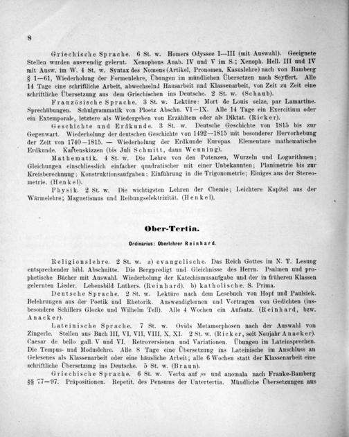 Lateinische Sprache. 7 St. w. Ovids Metamorphosen nach der Auswahl von Zingerle. Stellen aus Buch III, VI, VII, VIII, X, XI. 2 St. w.(Ricker, seit Neujahr Anacker). Caesar de bello gall. V und VI. Retroversionen und Variationen. Übungen im Lateinsprechen. Die Tempus- und Moduslehre. Alle 8 Tage eine Übersetzung ins Lateinische im Anschluss an Gelesenes als Klassenarbeit oder eine häusliche Arbeit; alle 6 Wochen statt der Klassenarbeit eine schriftliche Übersetzung ins Deutsche. 5 St. w.(Braun).