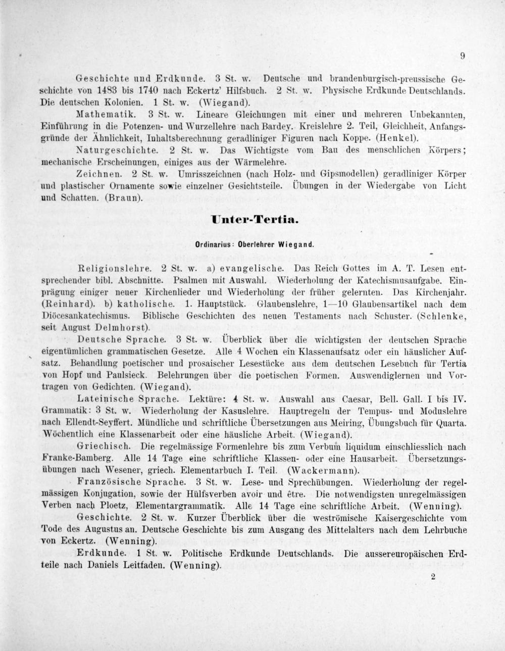 Deutsche Sprache. 3 St. w. Überblick über die wichtigsten der deutschen Sprache eigentümlichen grammatischen Gesetze. Alle 4 Wochen ein Klassenaufsatz oder ein häuslicher Auf- satz. Behandlung poetischer und prosaischer Lesestücke aus dem deutschen Lesebuch für Tertia von Hopf und Paulsieck. Belehrungen über die poetischen Formen. Auswendiglernen und Vor- tragen von Gedichten.(Wiegand).