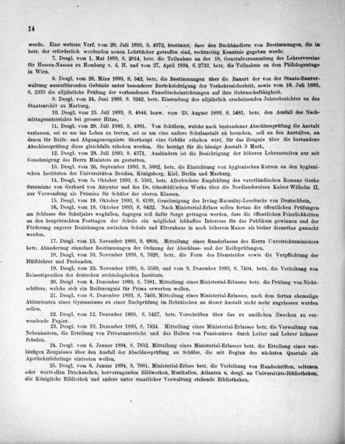 21. Desgl. vom 8. Dezember 1893, S. 7403, Mitteilung eines Ministerial-Erlasses, nach dem fortan ehemalige Abiturienten eines Gymnasiums zu einer Nachprüfung im Hebräischen an dieser Anstalt nicht mehr zugelassen werden