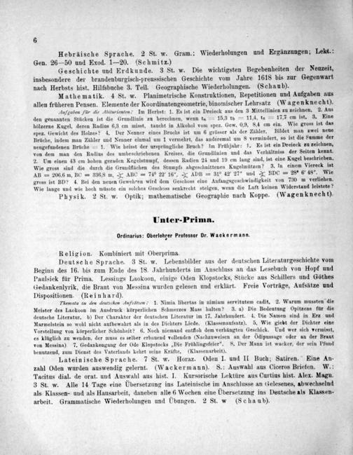 Deutsche Sprache. 3 St. w. Lebensbilder aus der deutschen Literaturgeschichte vom Beginn des 16. bis zum Ende des 18. Jahrhunderts im Anschluss an das Lesebuch von Hopf und Paulsiek für Prima. Lessings Laokoon, einige Oden Klopstocks, Stücke aus Schillers und Göthes Gedankenlyrik, die Braut von Messina wurden gelesen und erklärt. Freie Vorträge, Aufsätze und Dispositionen.(Reinhard).