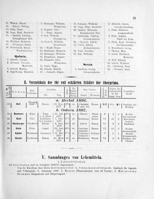 1. Lehrerbibliothek. An Geschenken sind im Schuljahr 1896/97 eingegangen: Von Sr. Excellenz dem Herrn Kultusminister: 1. Schenckendorf-Schmidt, Jahrbuch für Jugend- und Volksspiele, 5. Jahrgang 1896; 2. Meurer, Pflanzenformen(mit 68 Tafeln); 3. Marcinowsk y- Frommel, Bürgerrecht und Bürgertugend.